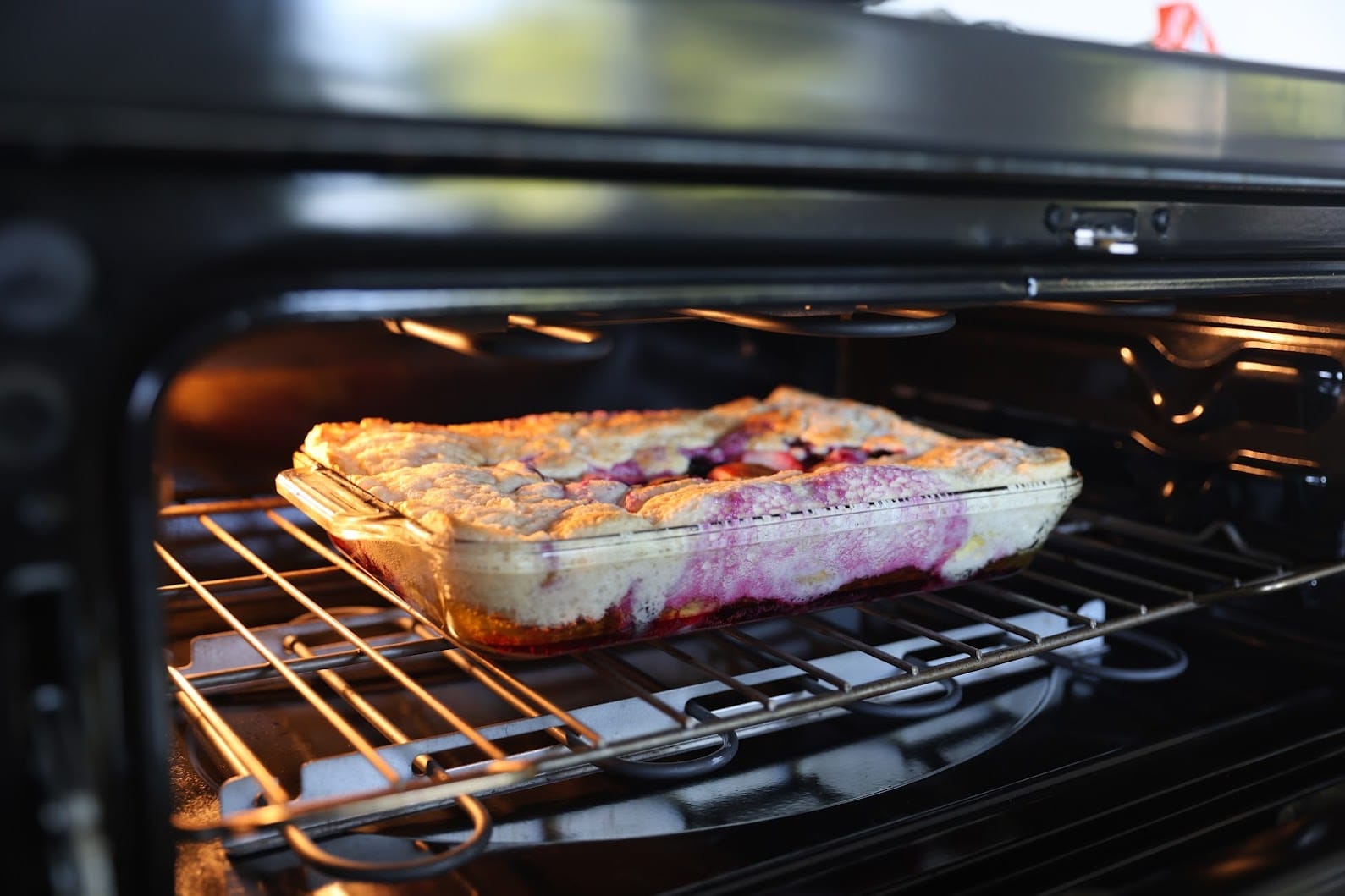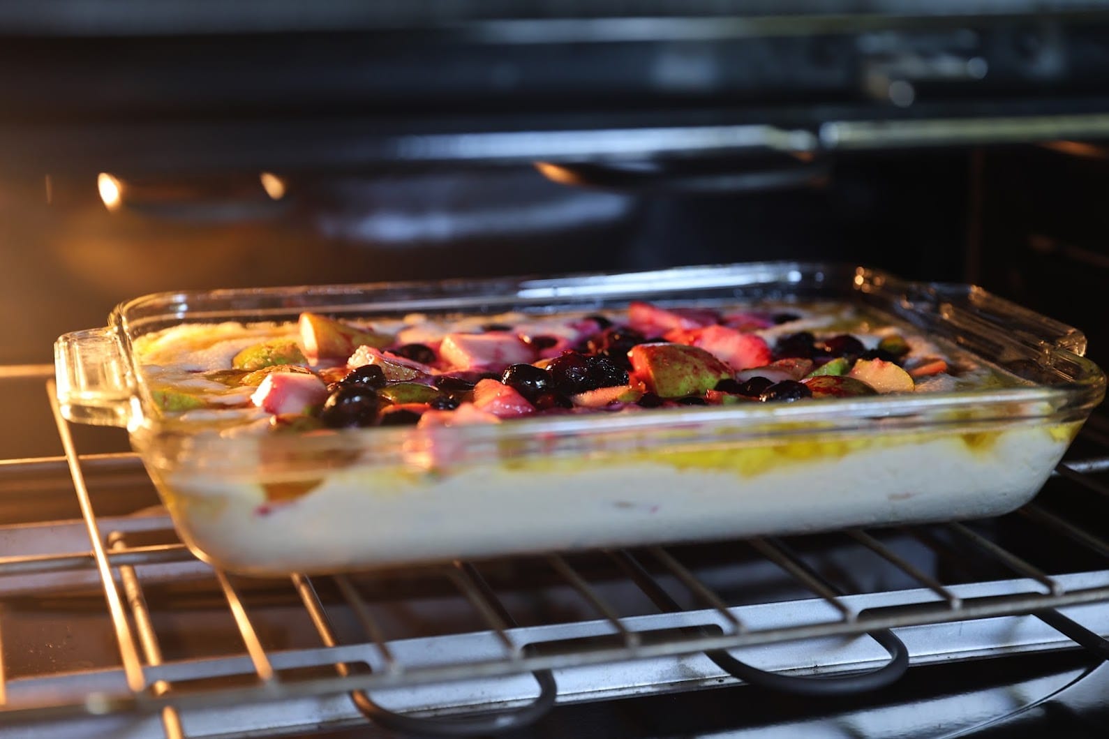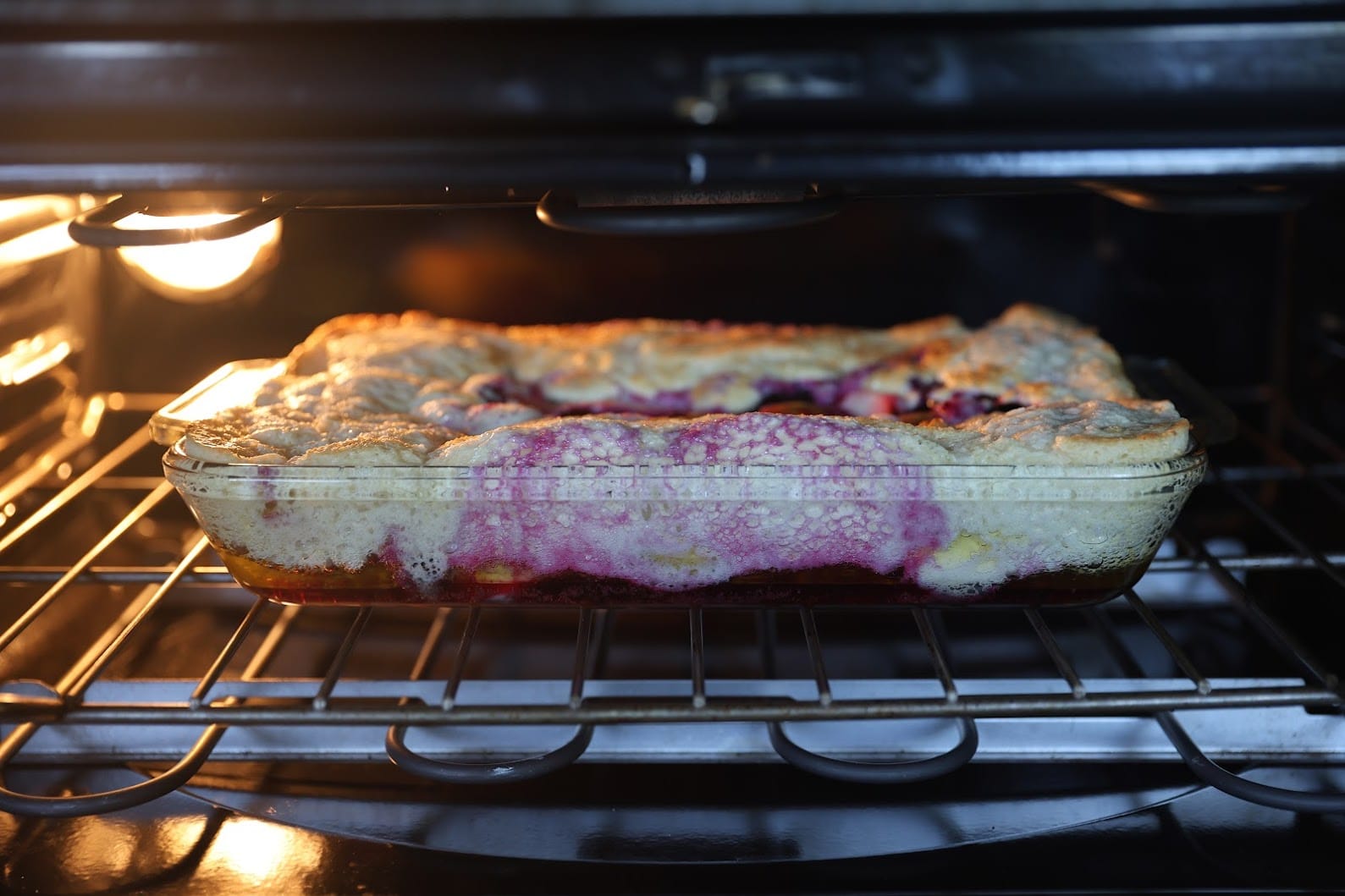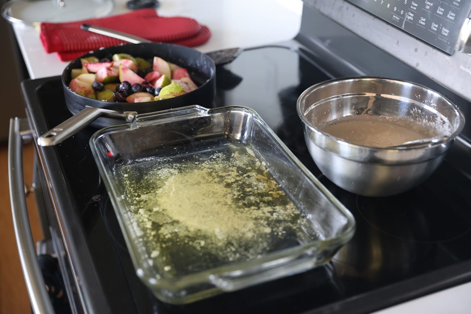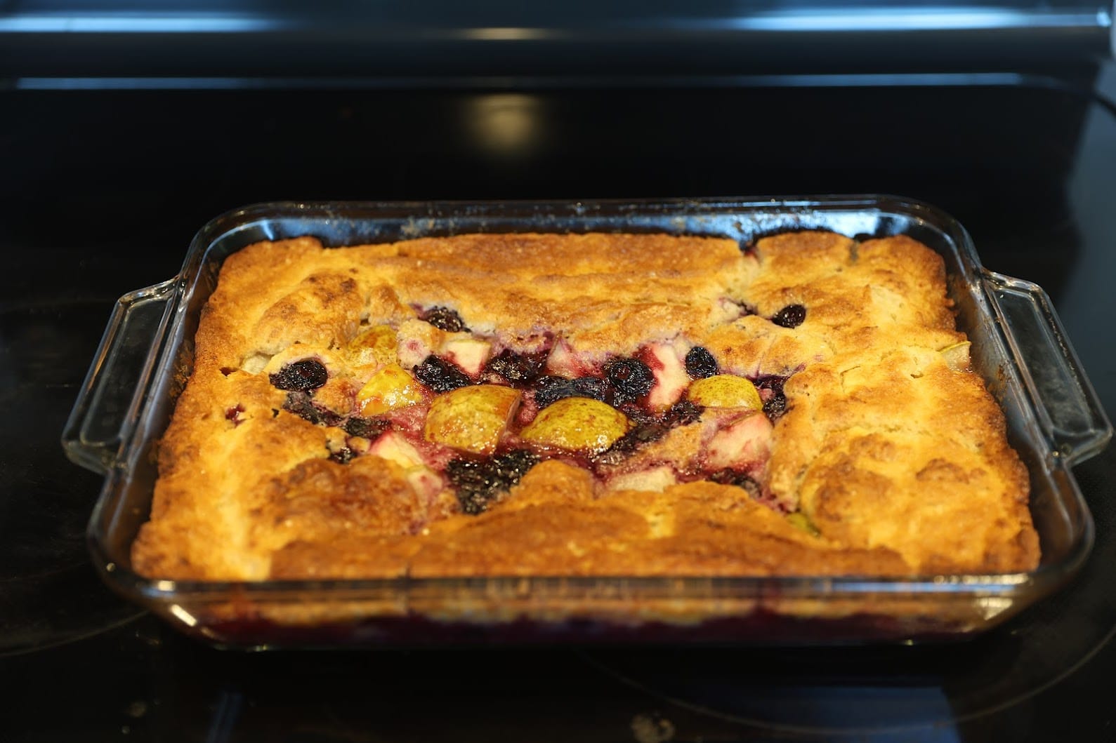 - Pour the batter into the butter in one contiguous blob, then drop the pears and berries onto the middle and flatten out. Don't mix the batter or the butter!