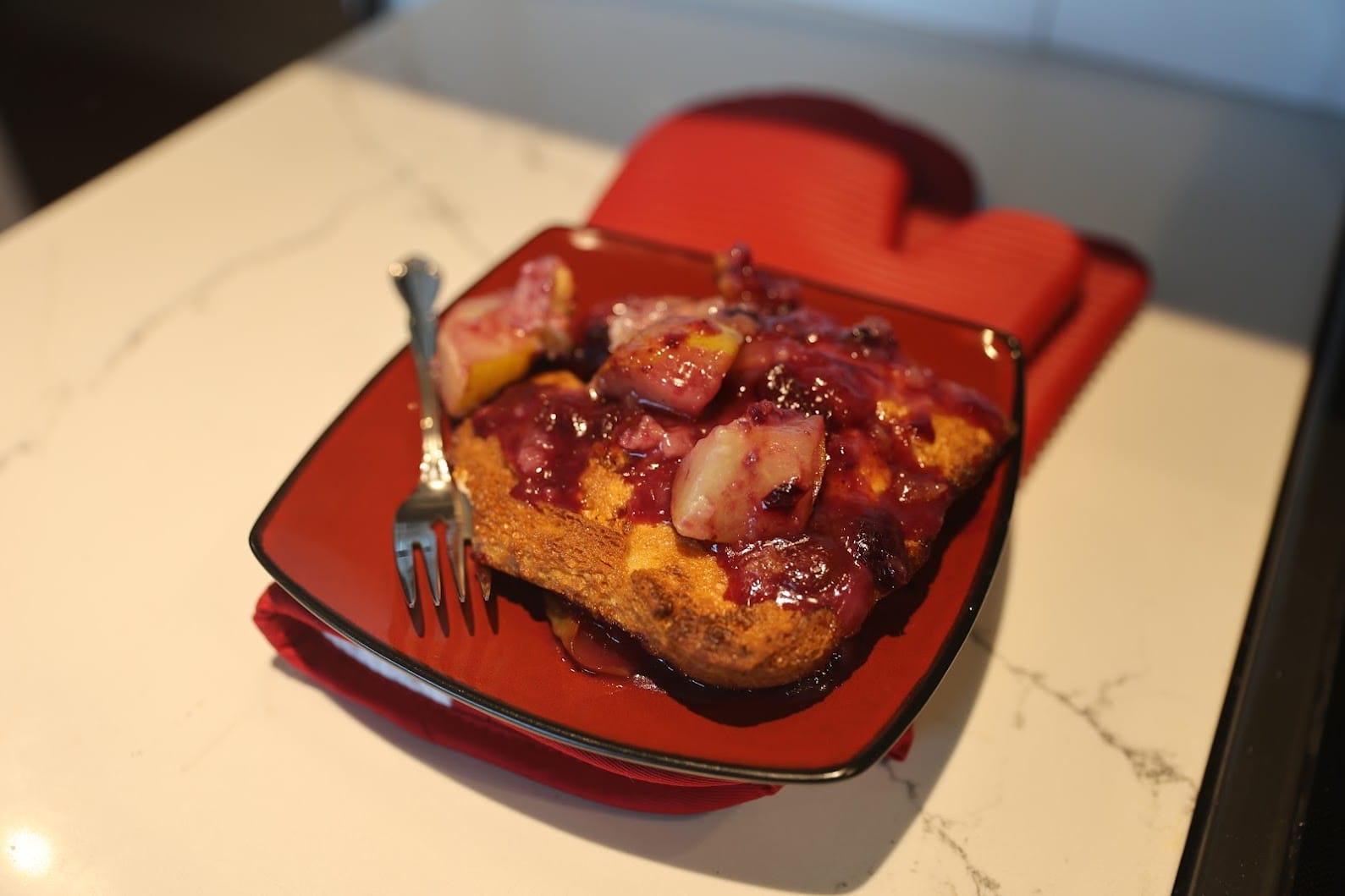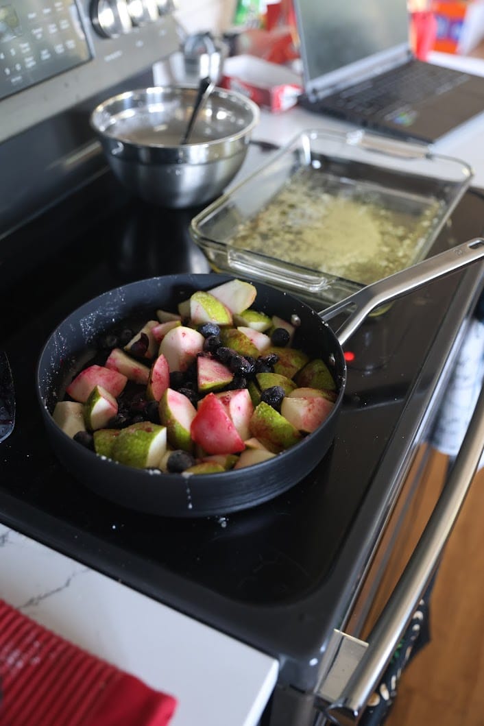 - 3/4 cup granulated sugar mixed into 4 diced pears and some blueberries (about 1 carton), cooked on the stove to mix juices and sugar into a syrup