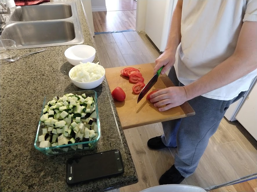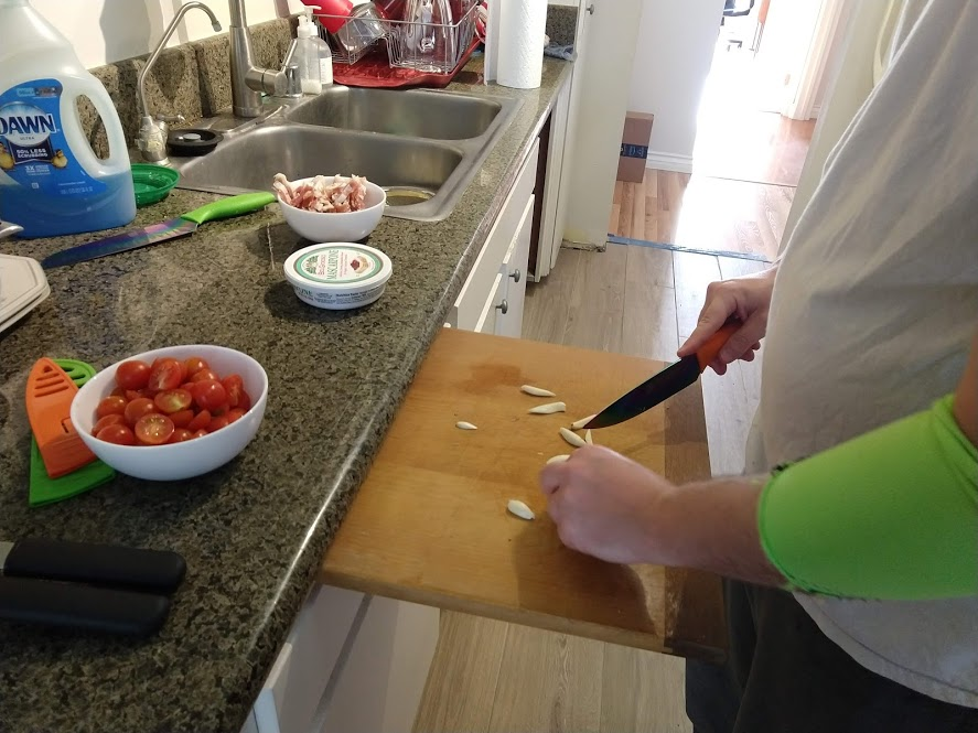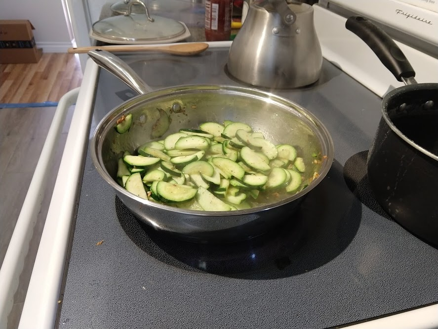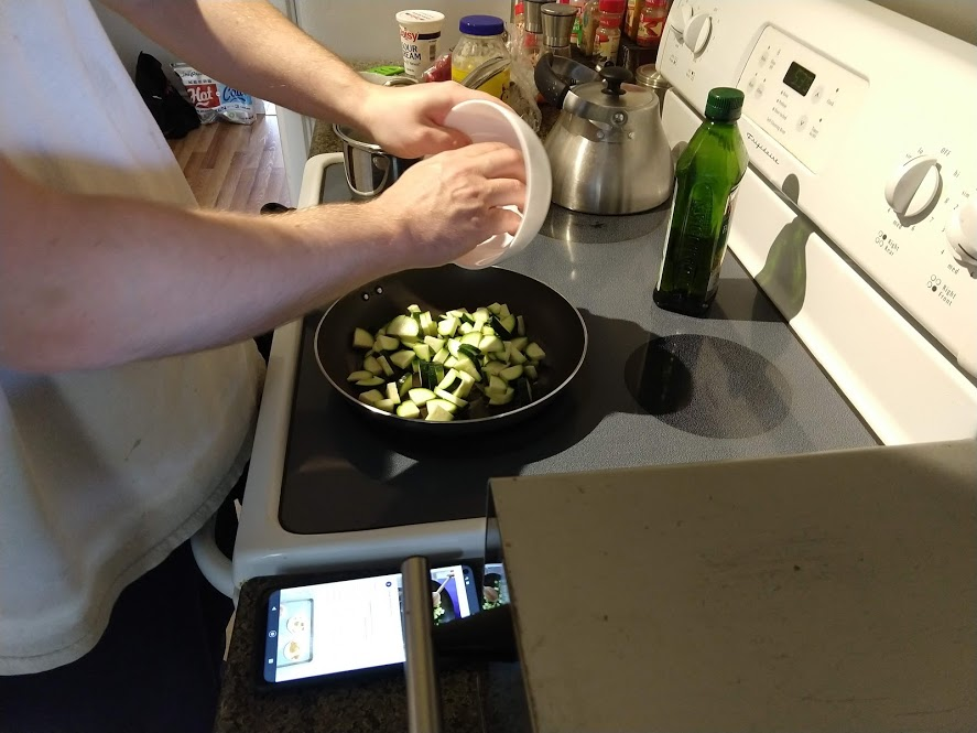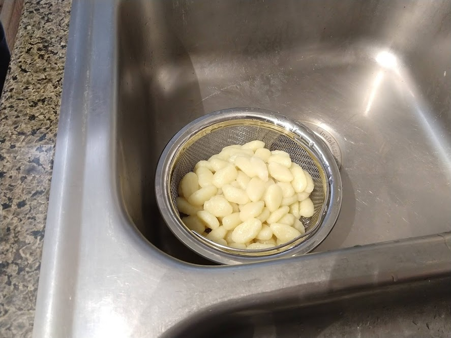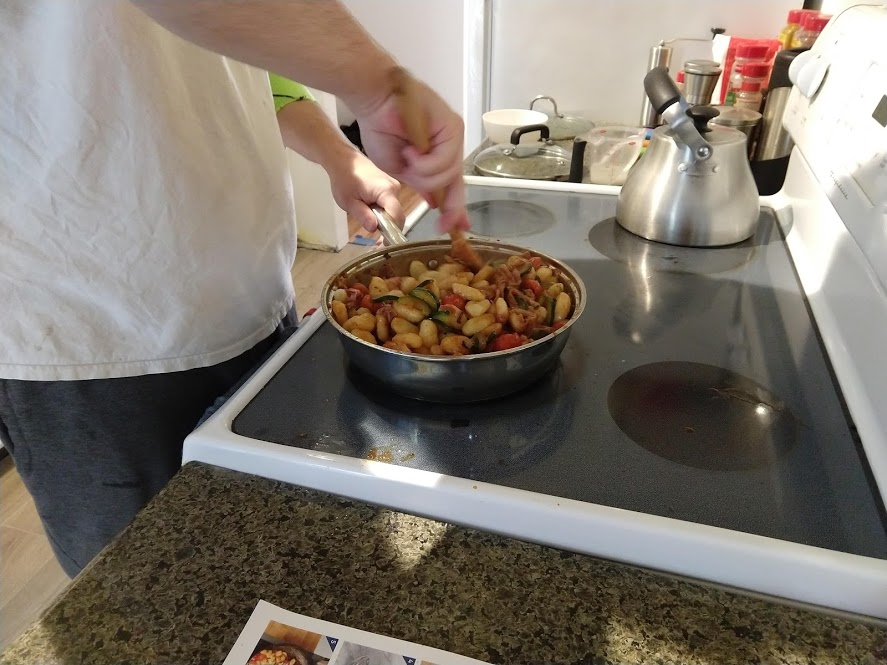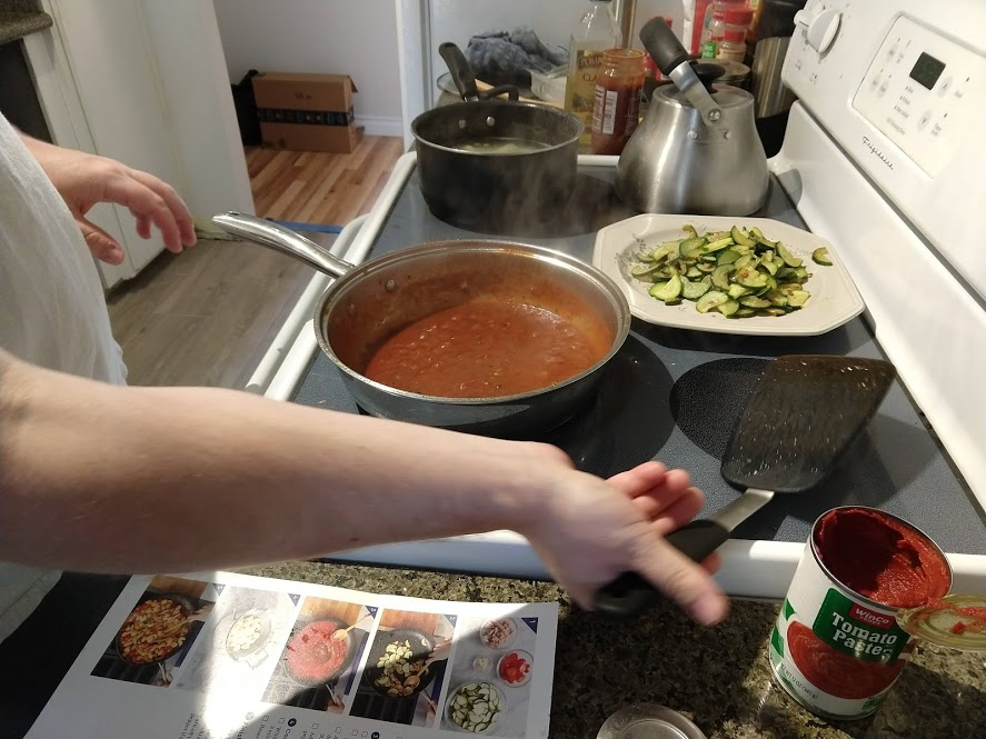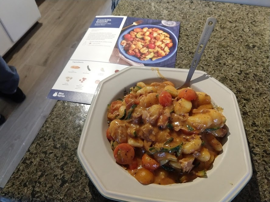 Next up is the prosciutto gnocchi with pan-seared zucchini and Calabrian chile tomato sauce. The recipe is from Blue Apron here, but we did it using store bought ingredients.