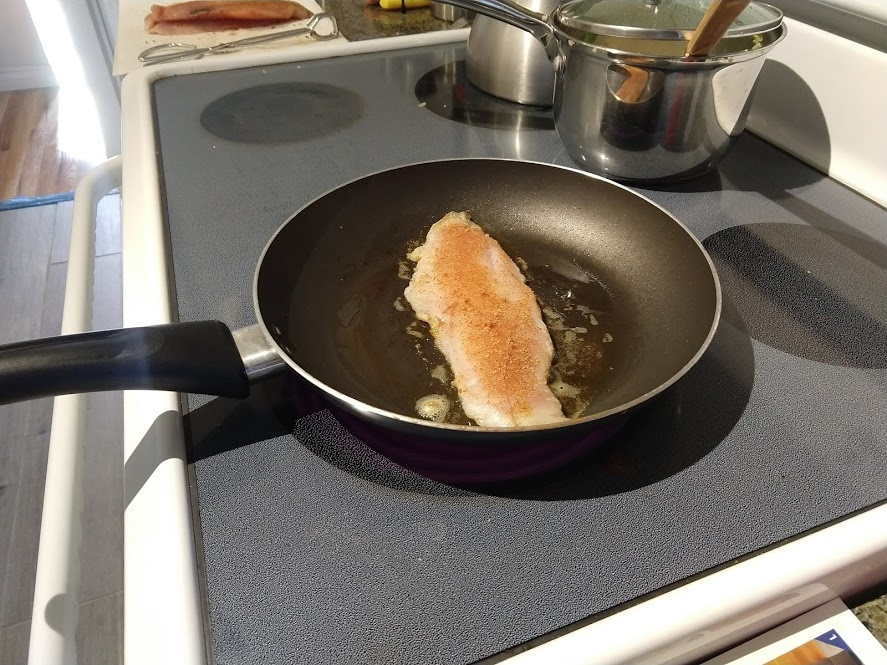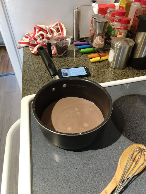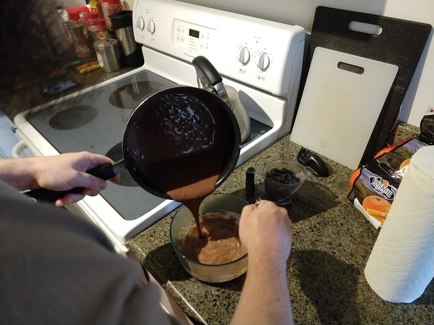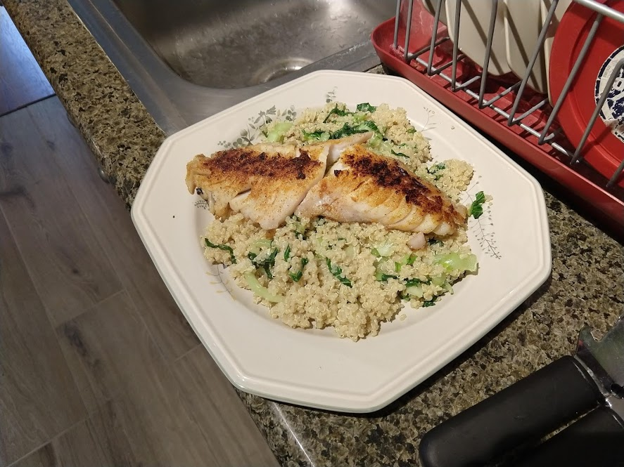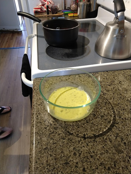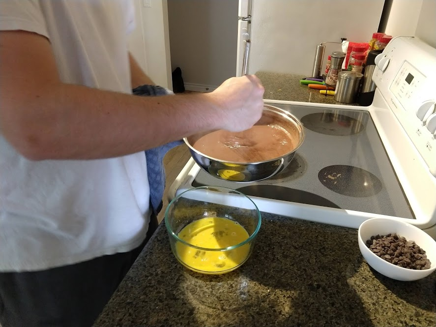 Milk and cocoa powder and sugar...Egg...Preparing to pour the cocoa mixture into the eggPouring in the cocoa mixture. Note the chocolate chips in the measuring cup, added just after thisEnd result! DeliciousJohn cutting green onions for dinner-Rock bassBok choy and quinoa in the potPan searing the rock bassLemon-honey quinoa with bok choyWith the rock bass added