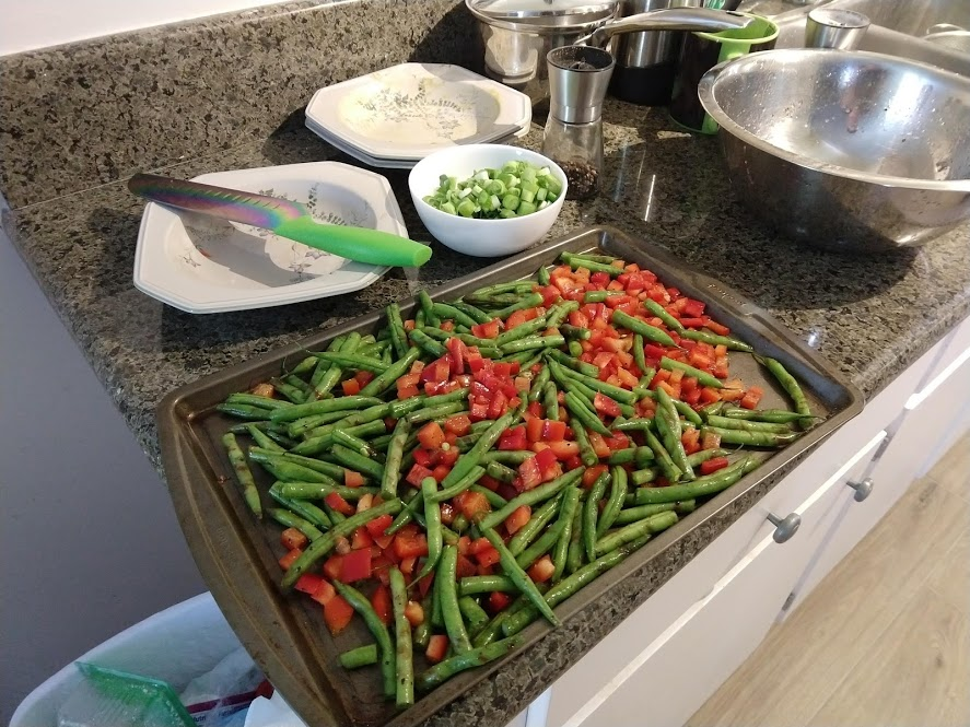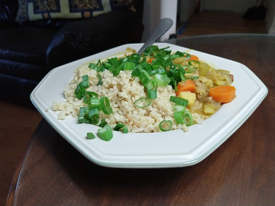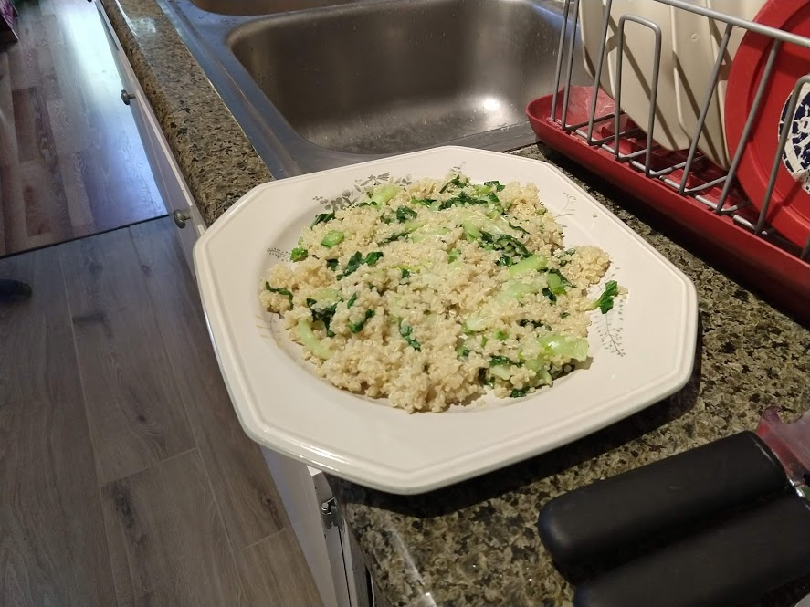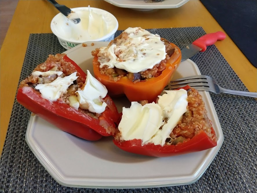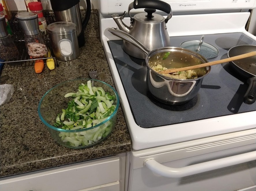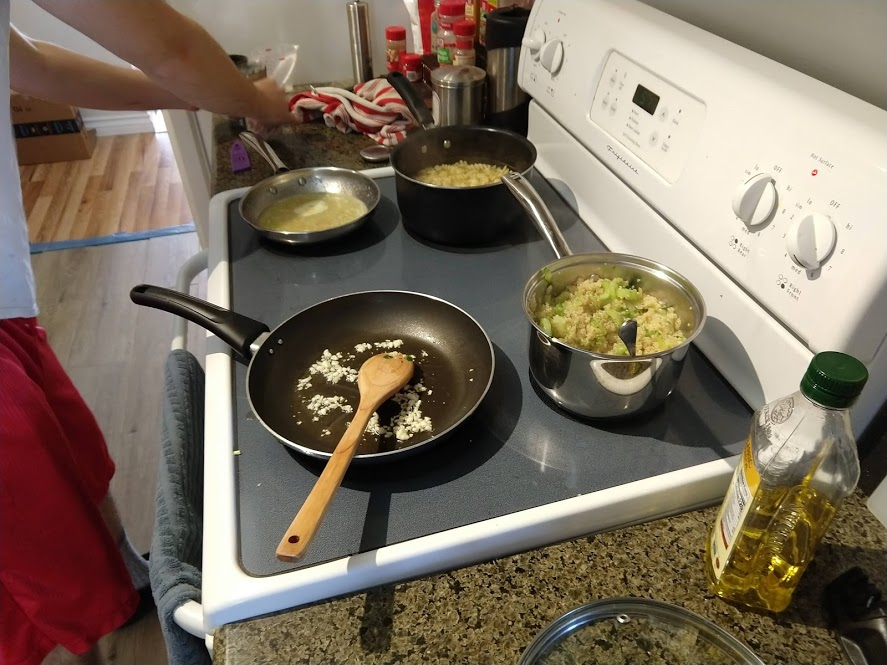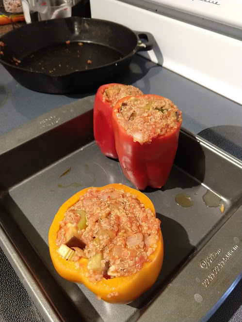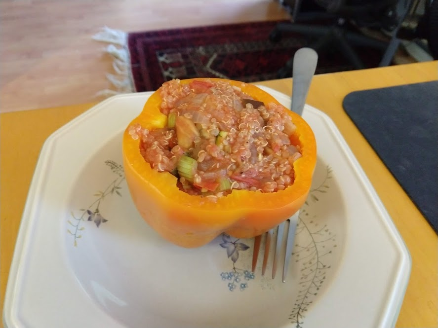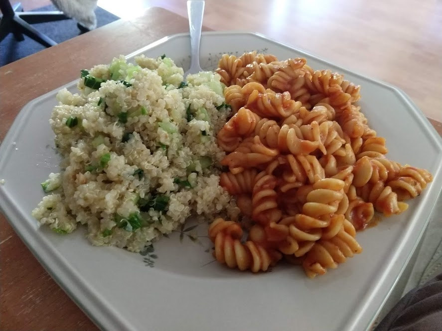 Quinoa in the pot on the right, pasta in the pot at the top rightStraightforward but goodPrepping the ingredientsCooking with cast ironAdded in tomato sauceHalf of the stuffed peppersOne of the peppersWith cheese spread atop themSalt rime potatoes with oil and rosemaryAsparagus (veggie fries in the background)Baked veggie friesAll together: salt rime potatoes, asparagus, veggie friesPancake!Veggie prep as per usualMaking a potato curryQuinoa with fresh green onions sprinkled over, and potato curried stew on the far side