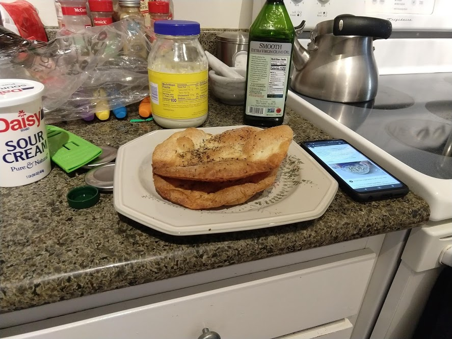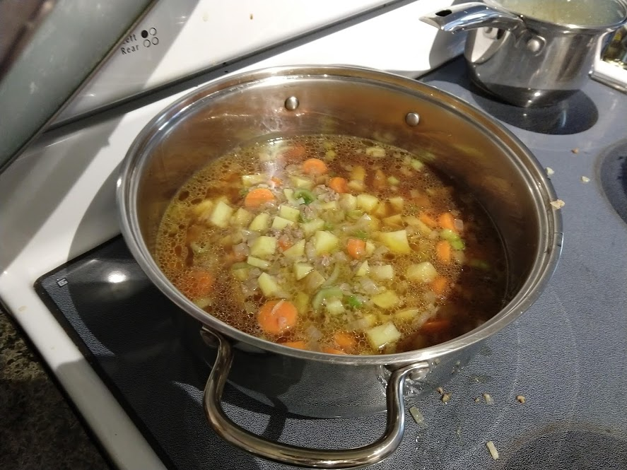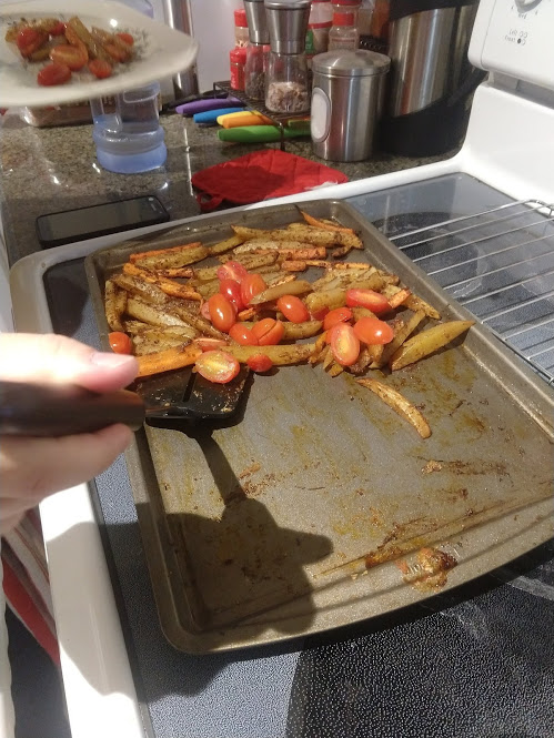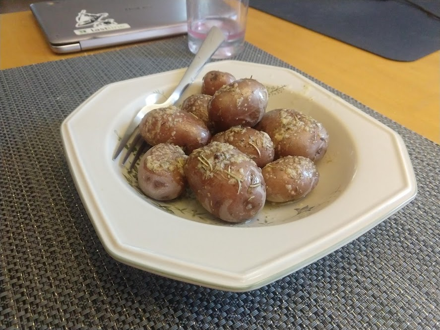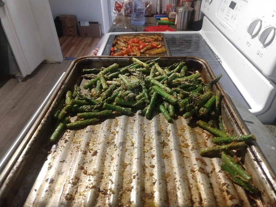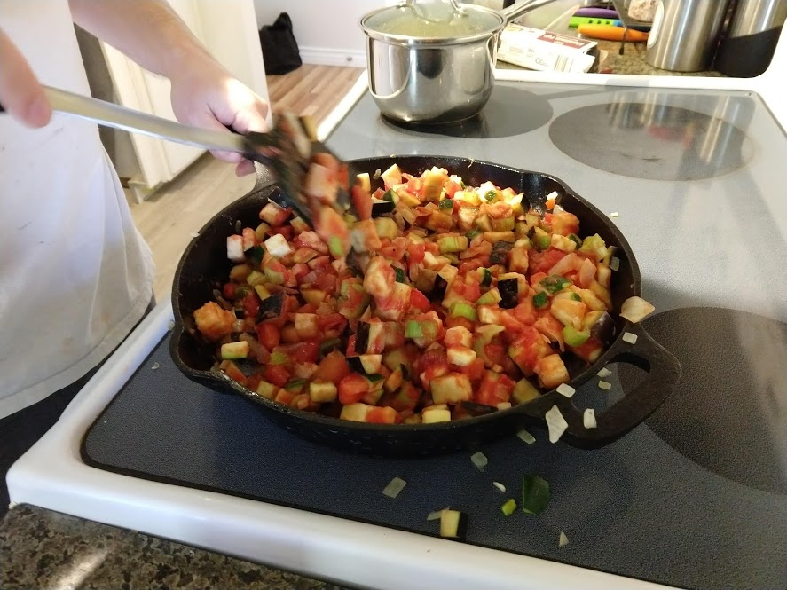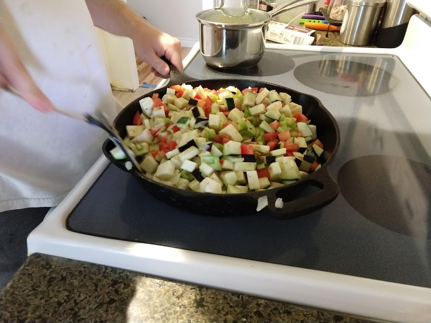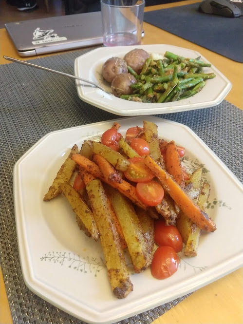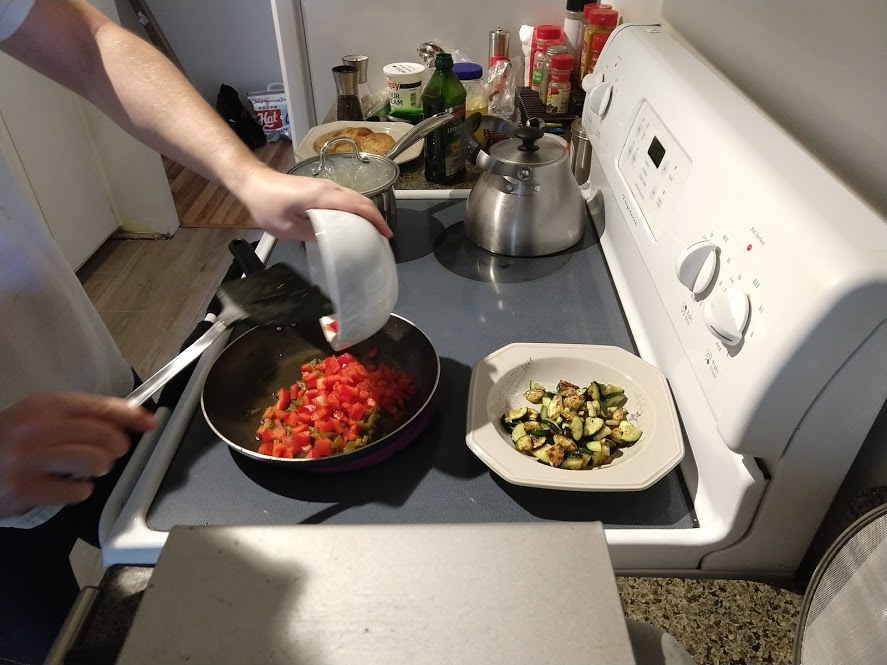 Quinoa in the pot on the right, pasta in the pot at the top rightStraightforward but goodPrepping the ingredientsCooking with cast ironAdded in tomato sauceHalf of the stuffed peppersOne of the peppersWith cheese spread atop themSalt rime potatoes with oil and rosemaryAsparagus (veggie fries in the background)Baked veggie friesAll together: salt rime potatoes, asparagus, veggie friesPancake!Veggie prep as per usualMaking a potato curryQuinoa with fresh green onions sprinkled over, and potato curried stew on the far side