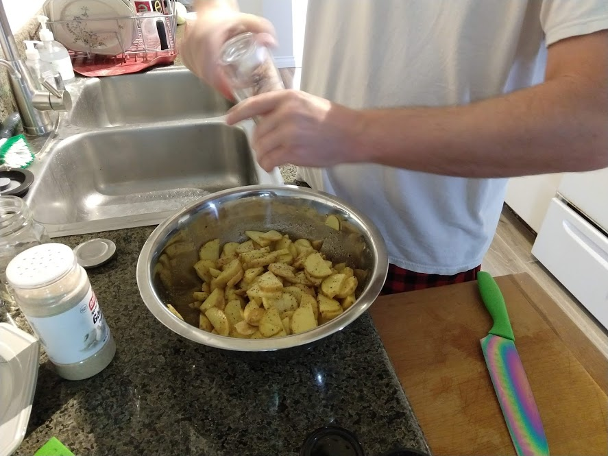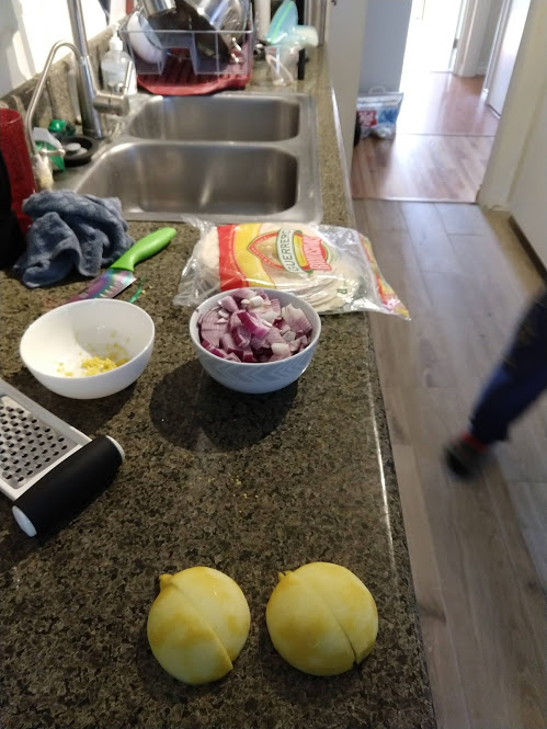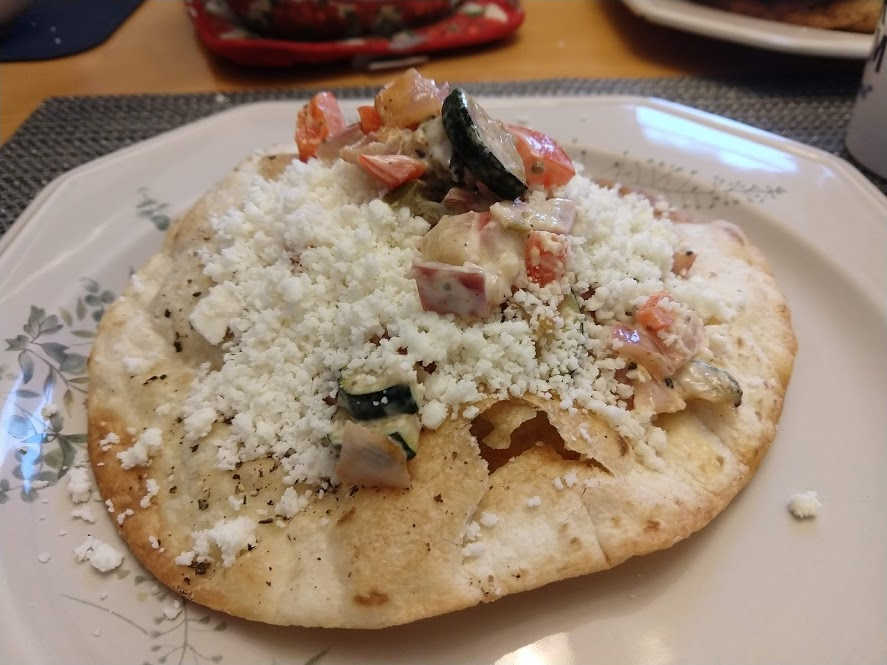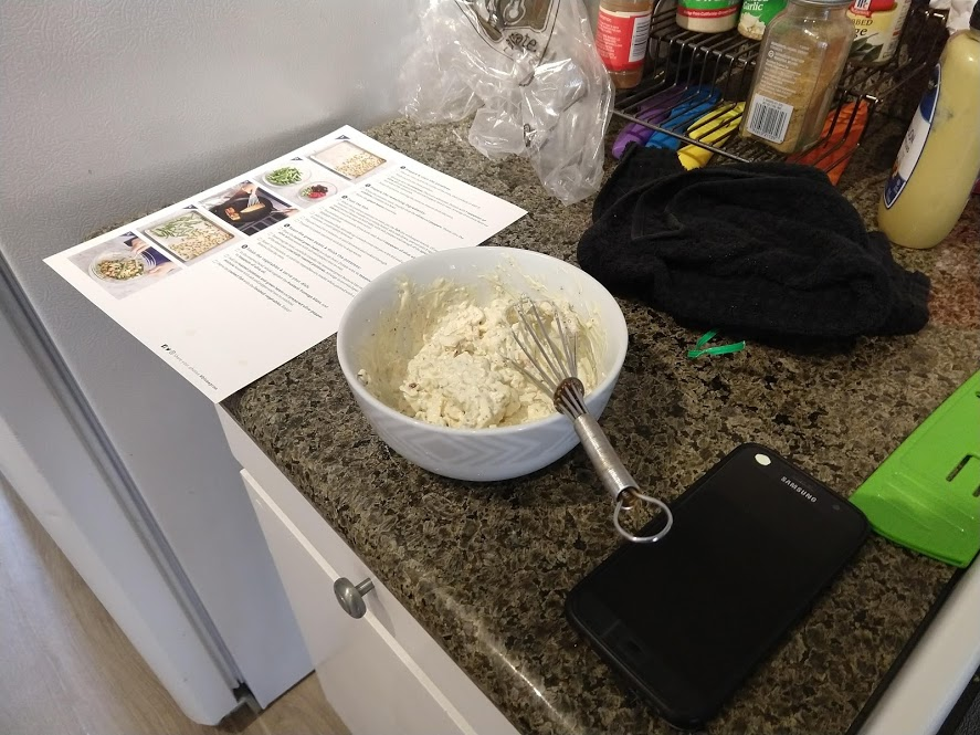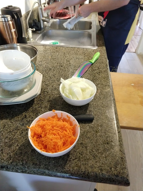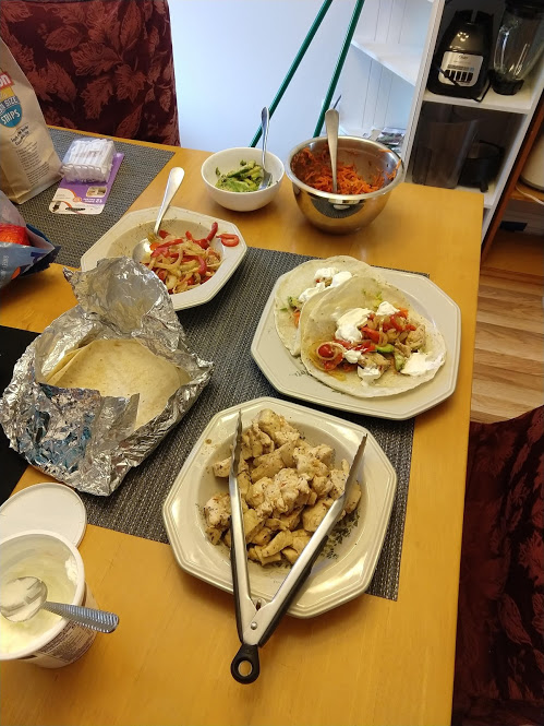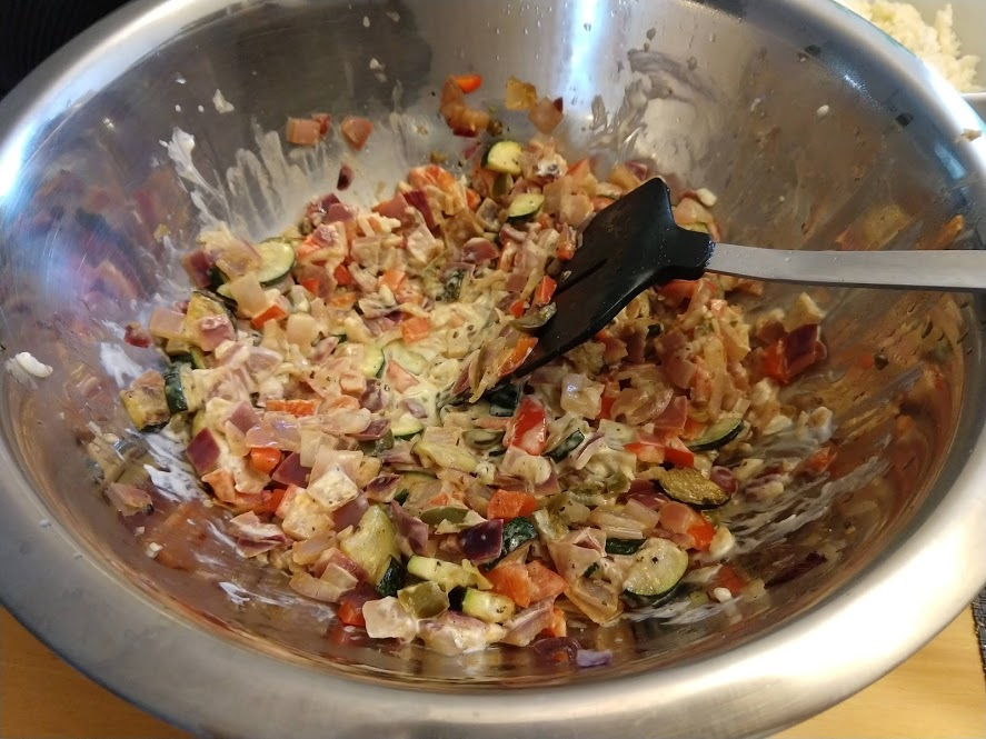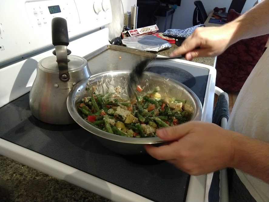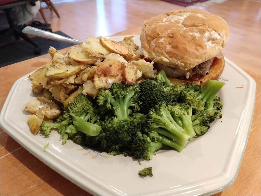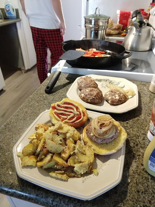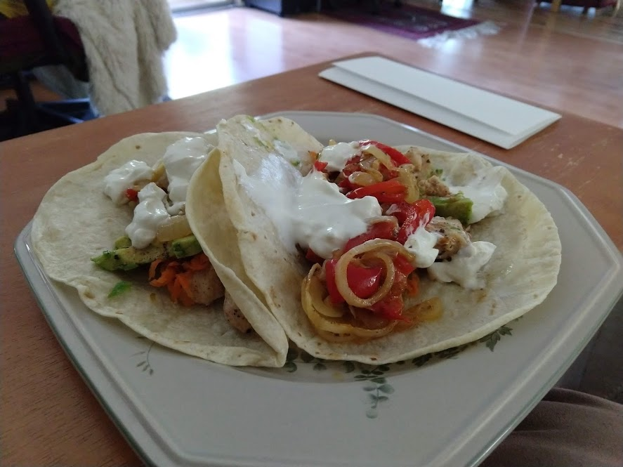 Preparing veggies to bakeMixing a cream sauceCream in the bowl, and...Mixing in the veggiesPlated with seared salmonCloseup of salmon and veggiesPrepping fries from potatoesSeasoning the potatoesCheese and ground beefFormed patties and chopping broccoliFlipped burger pattiesCooked burger, potato fries, and ongoing veggie cooking in the backgroundEnd result: burger, fries, broccoliShredded carrot and chopped onionCooking chickenMore cooking of chickenChicken fajitas! With avocado, grilled onions & bell peppers, and carrot jalapeno mixtureChicken fajita topped with sour creamJello since John had to do a fasting dietToasted bread and veggie mixture on topOur once-a-month dining out expenseSquash chunksZested lemons, onion, and flour tortillasBell pepper and jalapenoVeggies all mixed together after cookingBaked flour tortillasVeggie tostada