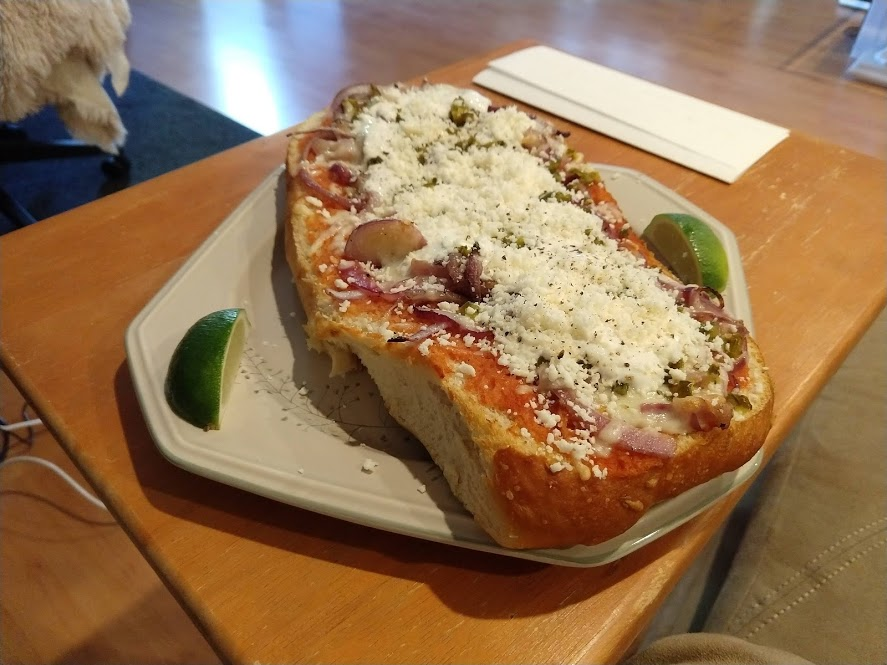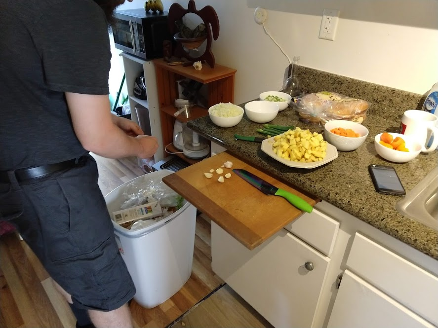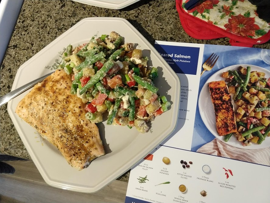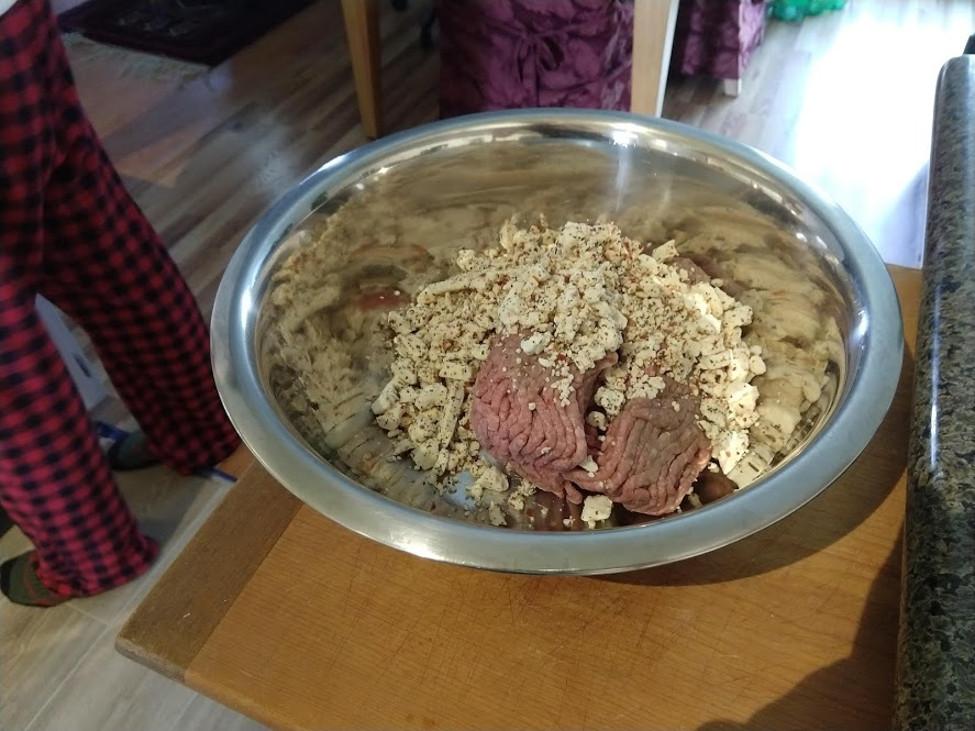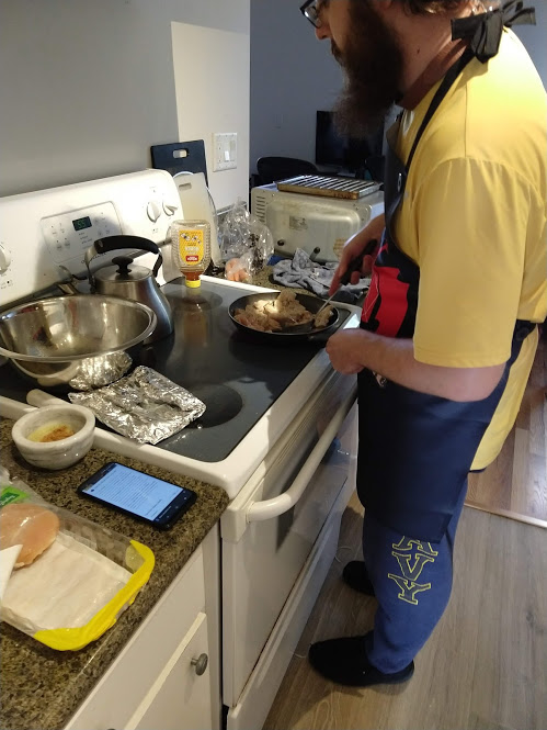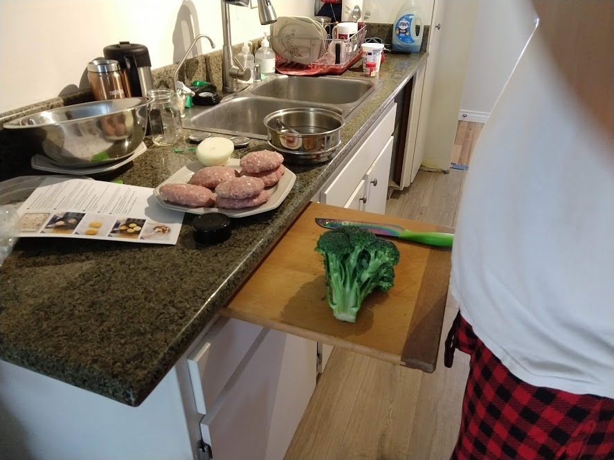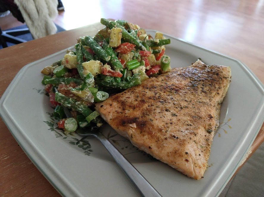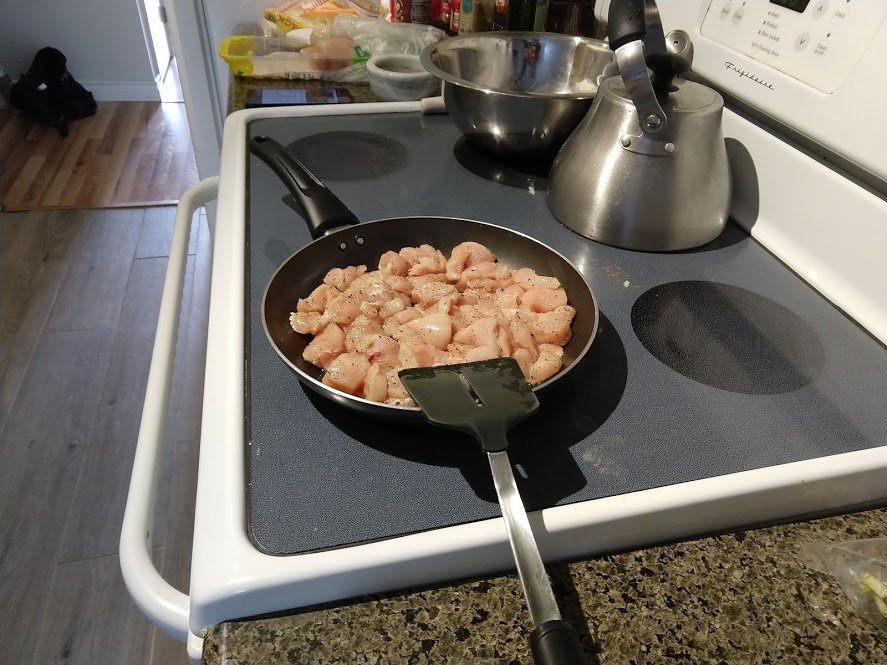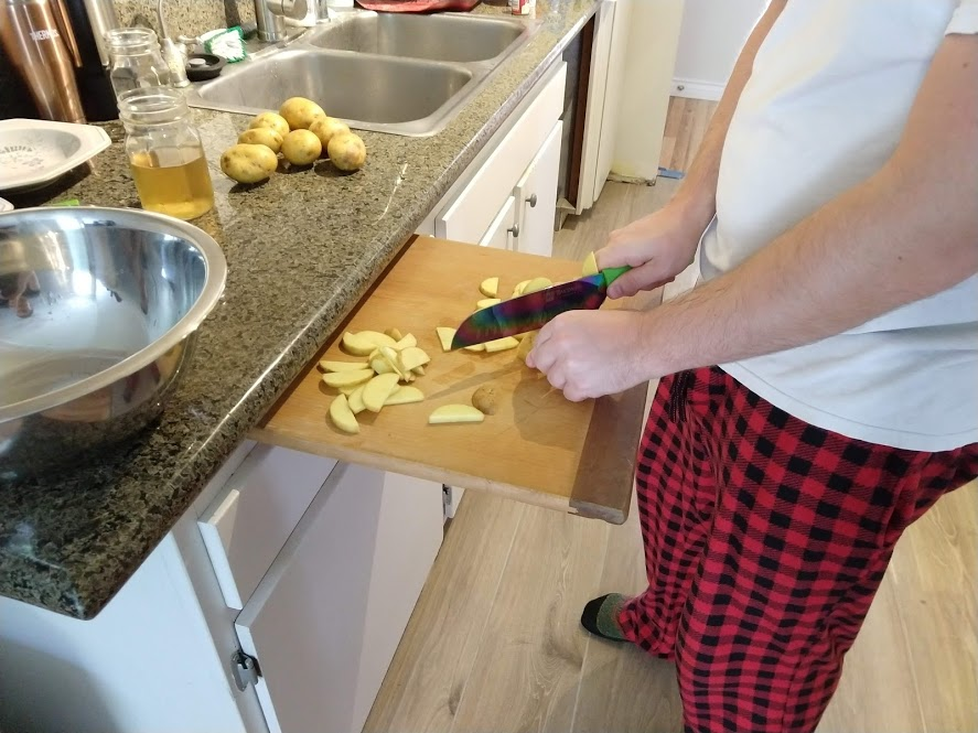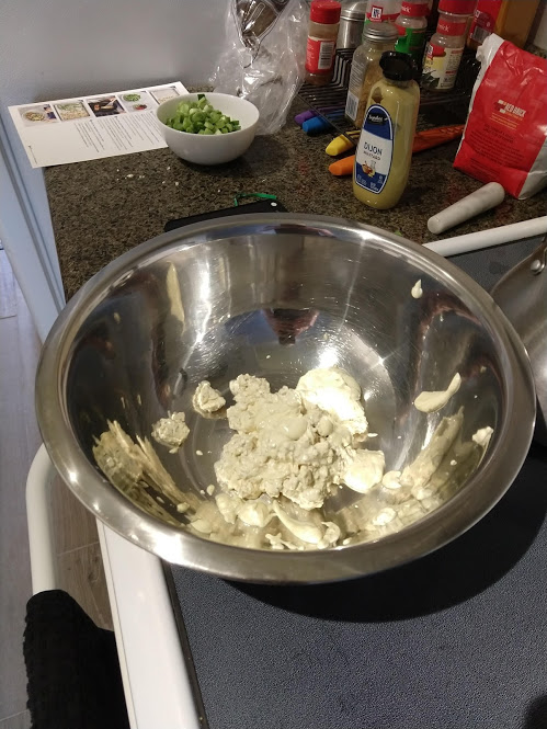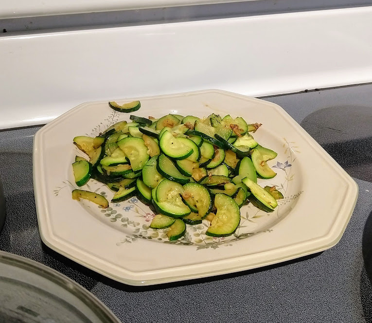 Preparing veggies to bakeMixing a cream sauceCream in the bowl, and...Mixing in the veggiesPlated with seared salmonCloseup of salmon and veggiesPrepping fries from potatoesSeasoning the potatoesCheese and ground beefFormed patties and chopping broccoliFlipped burger pattiesCooked burger, potato fries, and ongoing veggie cooking in the backgroundEnd result: burger, fries, broccoliShredded carrot and chopped onionCooking chickenMore cooking of chickenChicken fajitas! With avocado, grilled onions & bell peppers, and carrot jalapeno mixtureChicken fajita topped with sour creamJello since John had to do a fasting dietToasted bread and veggie mixture on topOur once-a-month dining out expenseSquash chunksZested lemons, onion, and flour tortillasBell pepper and jalapenoVeggies all mixed together after cookingBaked flour tortillasVeggie tostada
