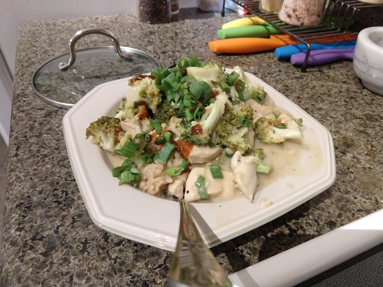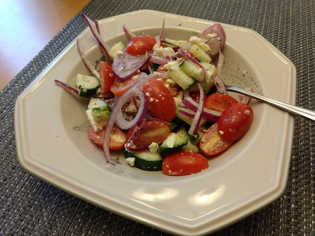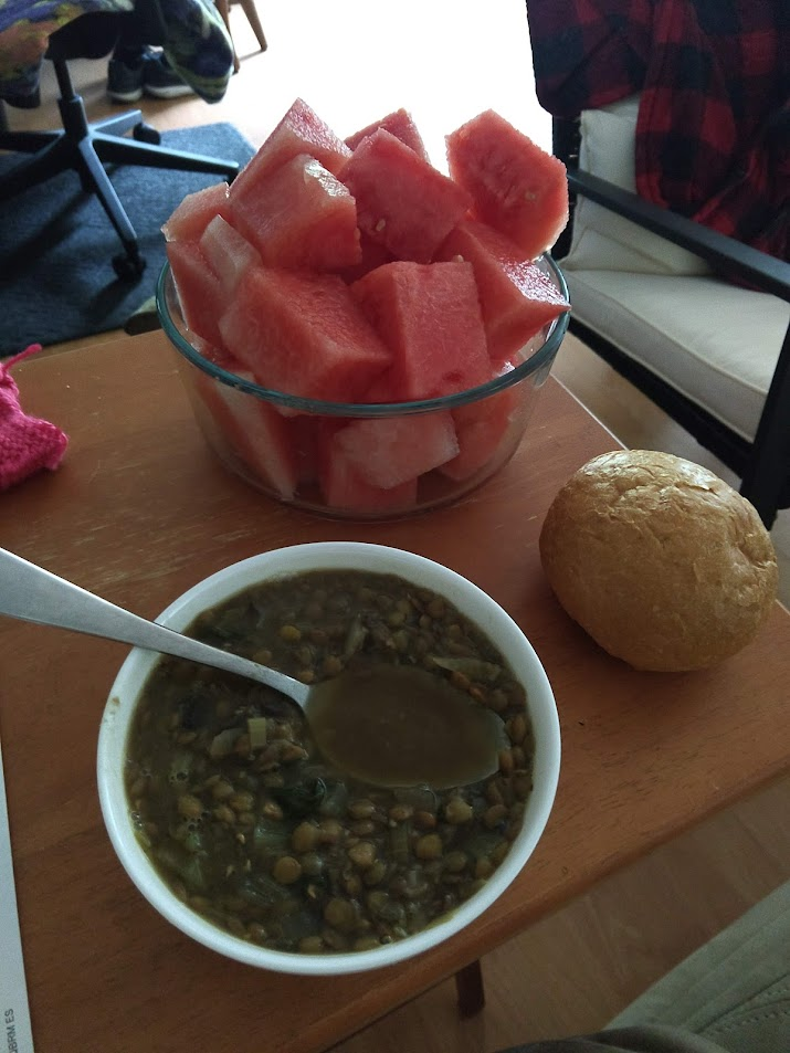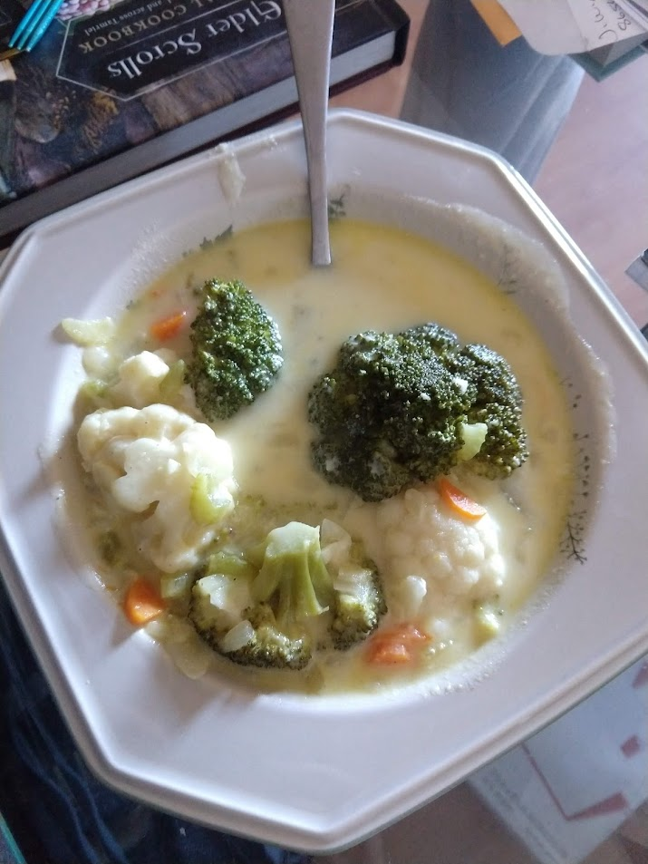 Broccoli and cauliflower cheesy soupCabbage stew with sausage and celery and potatoes and carrotsVeggie salad of cucumbers, tomatoes, onions, and crumbled goat cheeseTea and popcornMaking a pot of chaiThe remaining container of chaiTortellini and red sauceHot and sour soup with mushrooms and tofuPotato wedgesOrange chunks, avocado, peppers, onion diced up in a bowlSalmon steaksMaking taco shellsFruity spicy salmon tacosLeftover tacos and chickenLentil soup with oakleaf lettuce from our gardenLentil soup, bread roll, and watermelonEnchiladas with black beans and quinoaPlated enchiladasQuinoa and orange chicken-Quesadilla with sweet potato, corn, onionBroccoli and chicken in coconut lime saucePlated coconut lime chicken and broccoli