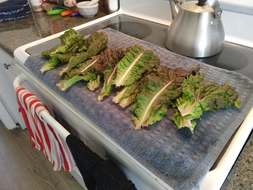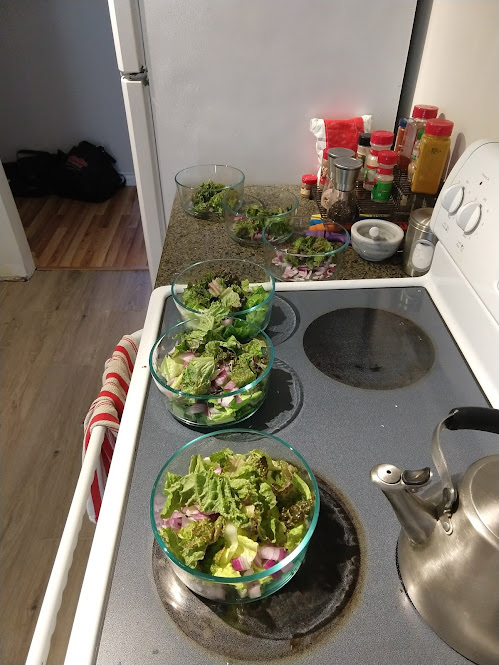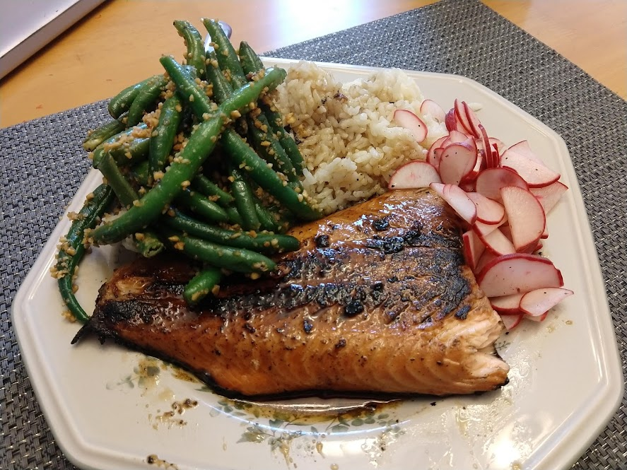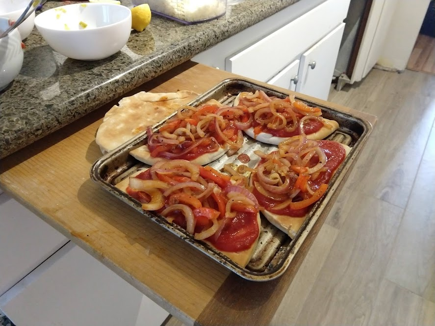 Flatbread pizzaSalad greens from our garden!Preparing sandwichesTeriyaki salmonAssembling the sandwichesAdding the salmon