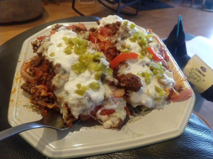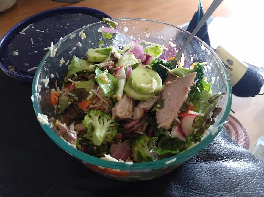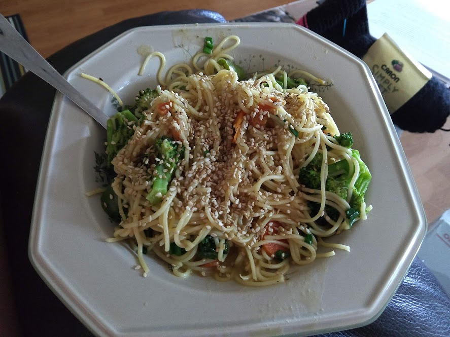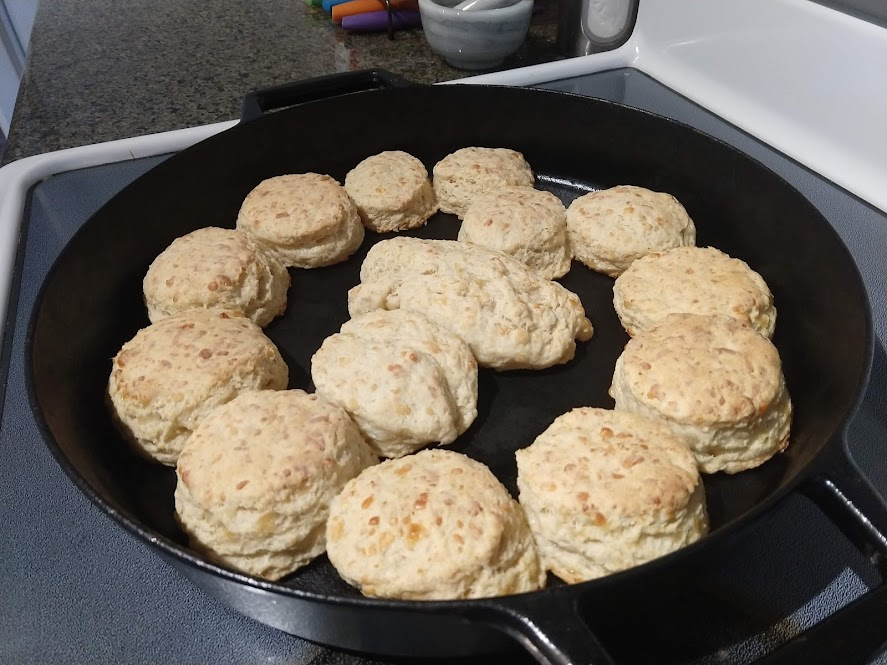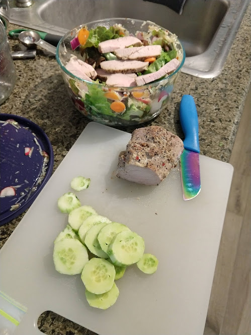 Sparkling water, coconut cream, and mango nectarJohn made "everything" stew againIngredients for biscuitsCutting out biscuits without a biscuit cutter...Close enough!And baked in a cast iron!Plated, sadly this one didn't rise too wellDinner with Grandma TruebloodOur favourite prosciutto gnocchi dish with zucchiniPita and veggies...Chorizo pizza-like baked pita!It has both cheese and sour cream on topNoodles and veggies and chickenLasagneSix salad bowlsHot and sour soup with tofu, egg, and mushroomSalmon on the stove for once!Green beans with chopped nuts, rice, radishes, and pan-seared salmonRamen from our local shop! Mine is coconut and lime brothNoodles with sesame seeds and veggiesCheddar biscuits again!This time they rose betterGarden-harvested cucumber, pork loin, and garden saladSalad all mixed together with the pork loin chunksChocolate chip pancake batterThe thing about cooking mistakes is that you can leave no evidenceMore noodles and chicken and veggiesAnimal style In-N-Out burgers and fries during our trip