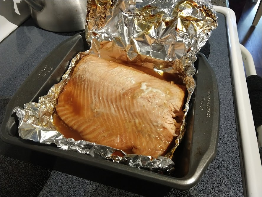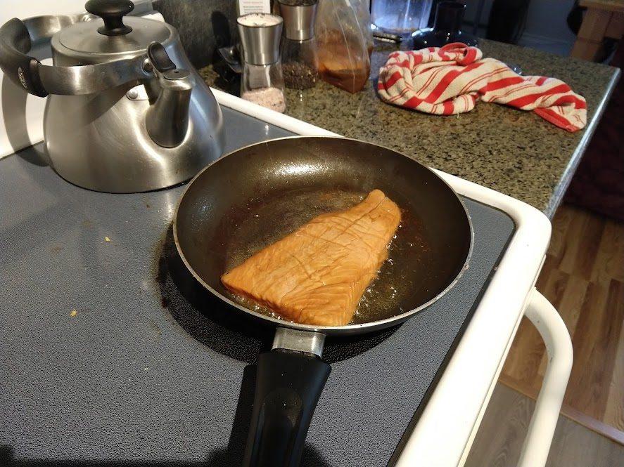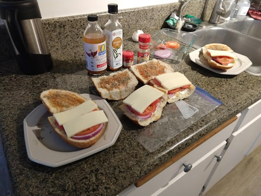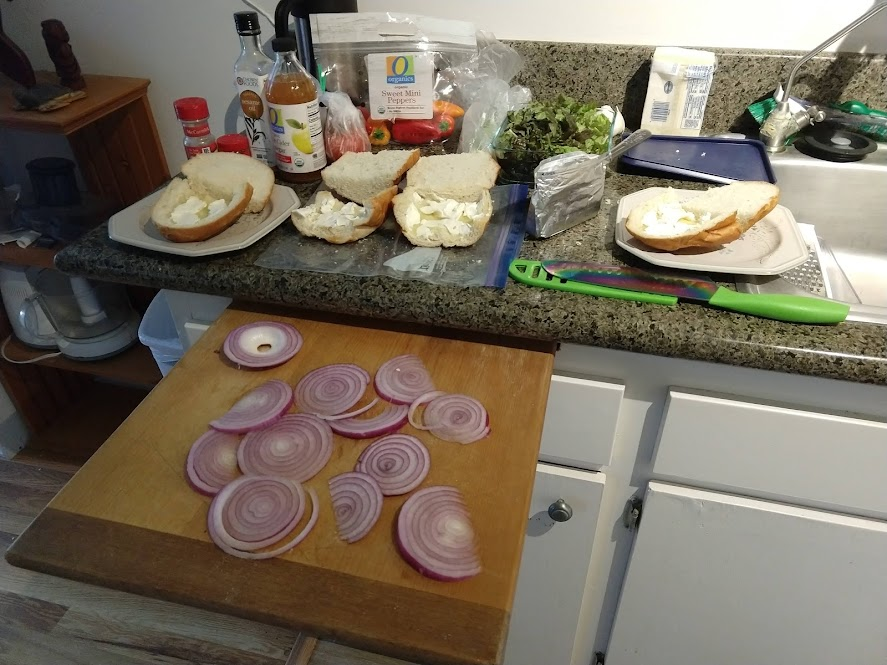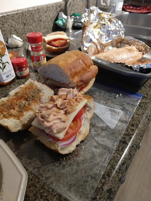 End result: teriyaki salmon sandwiches with sesame oil, apple cider vinegar, ground sage, cheese, tomatoes, onions, and cream cheese.