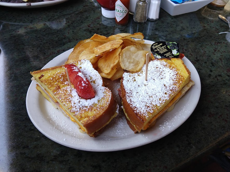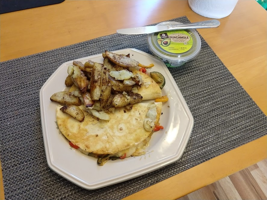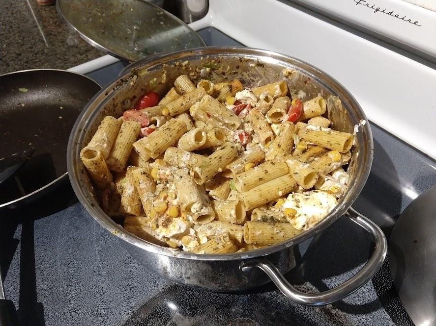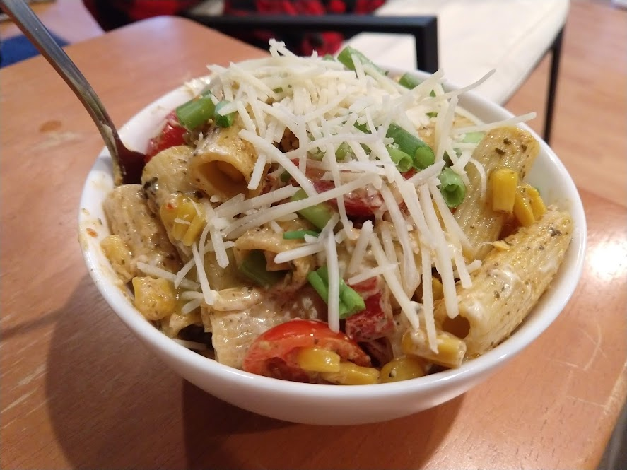 French toast sandwiches and crisps in LAPasta and pestoDished up with halved cherry tomatoes, corn, Parmesan cheese, green onionsGuacamole and mushroom quesadillas with a side of potatoesChocolate chip pancakes