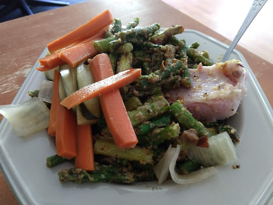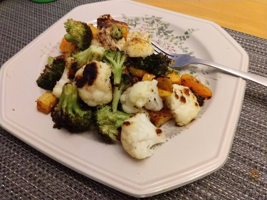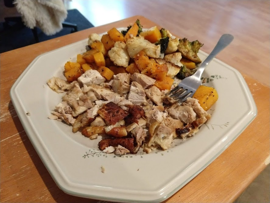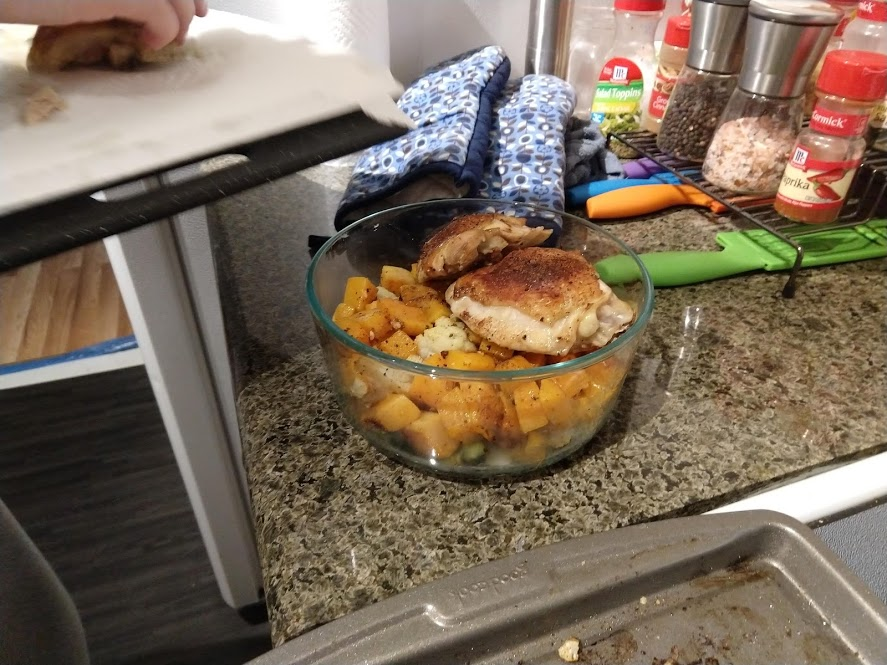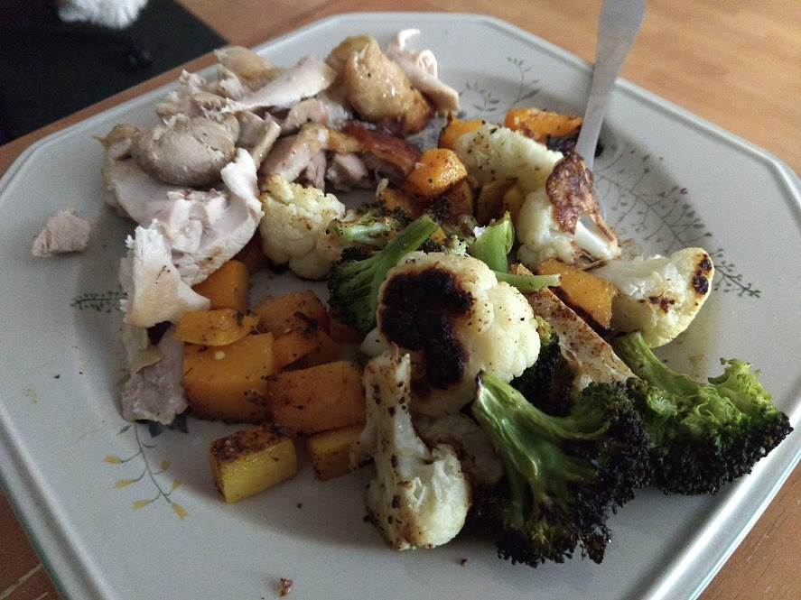 Next up John did baked chicken with butternut squash, broccoli, and cauliflower: