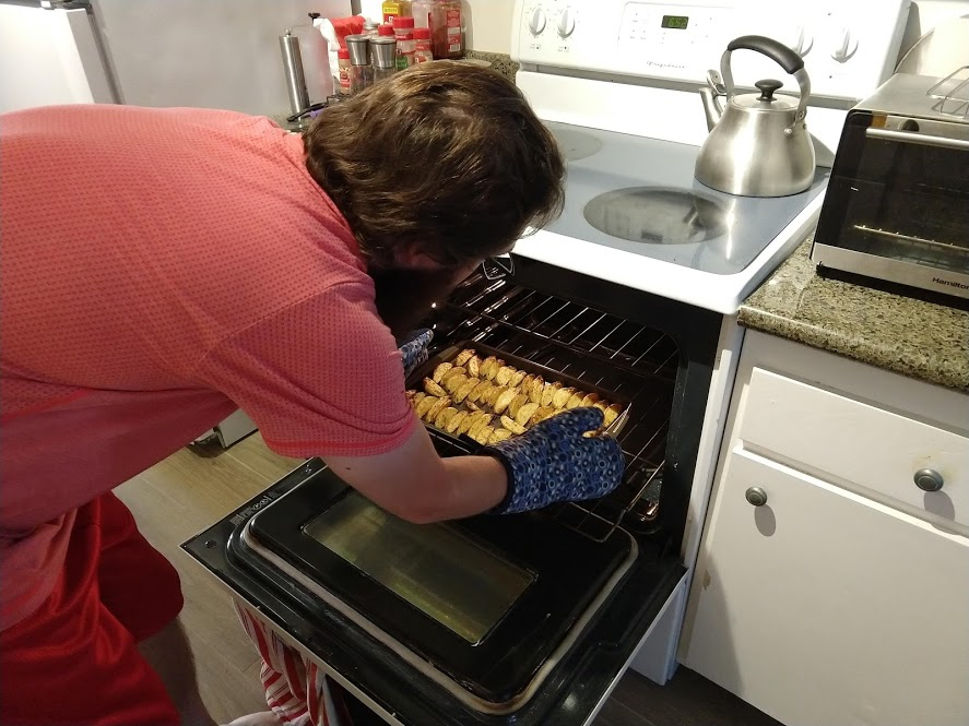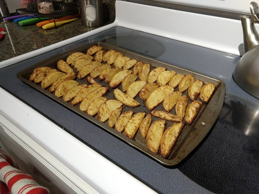 Next, John refined our recipe for potato wedges to make them extra crispy. We baked them at a lower temp, then turned it up high to crisp them: