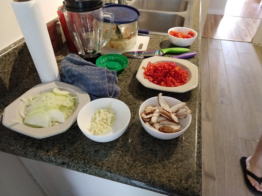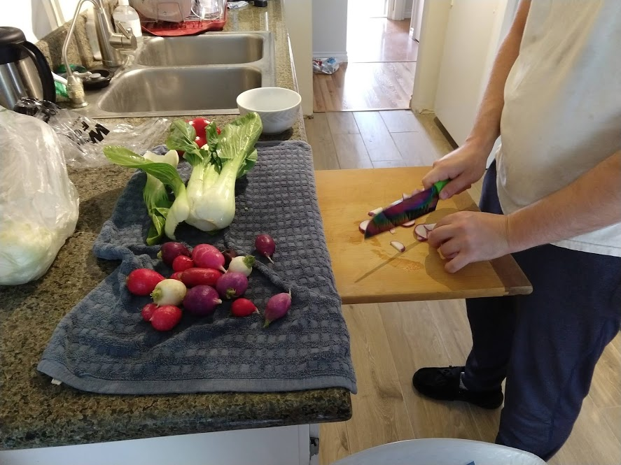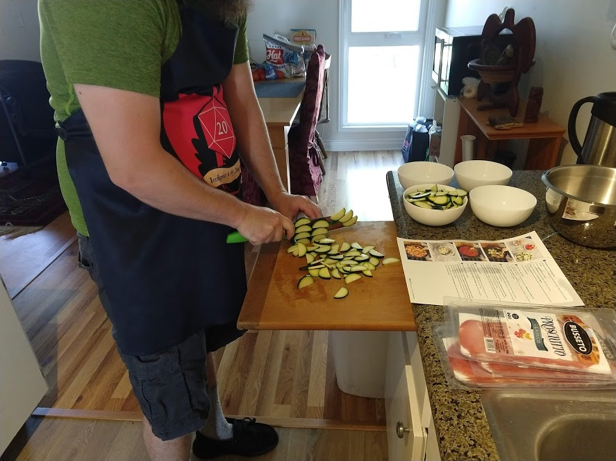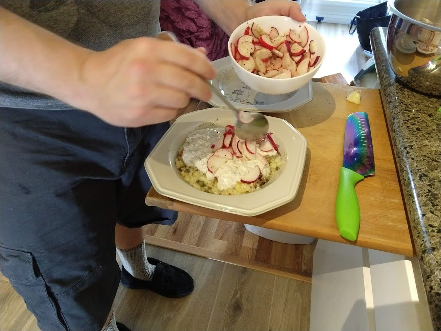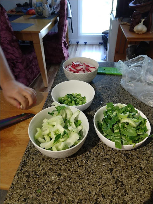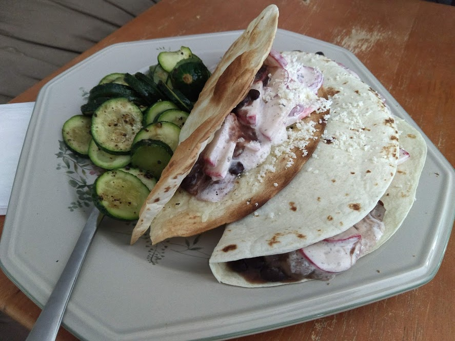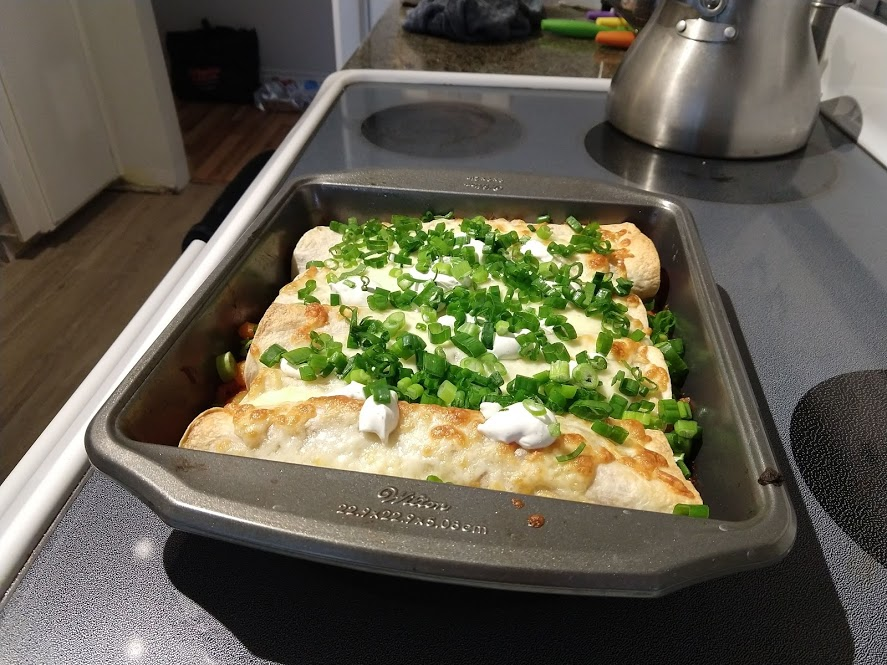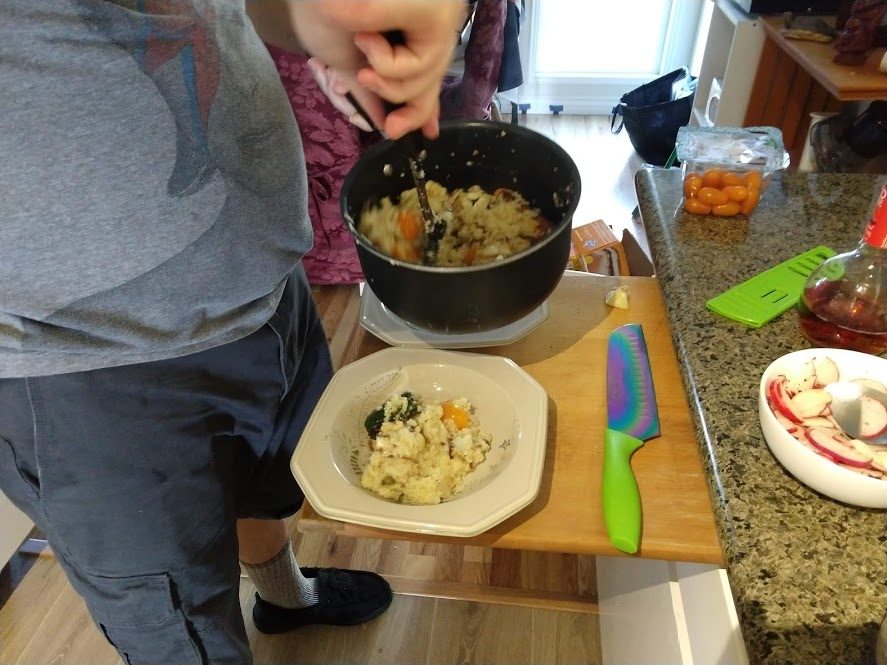 Cooking the enchilada fillingFilling and wrapping up!First one placed!Fresh out of the ovenDelicious enchiladas!Prepping veggiesCooking in progressStir-fry with radishes and peasLeftovers; note how the radishes have their colour spread out when you leave them in vinegarChopping radishesMaking meatballsCooking them in cast-ironBrowned meatballs!With veggies mixed inMeatballs and rice and radishes and veggiesPot stickers and riceSlow-cooker pork and split peas and bok choySplit pea soup!Oven-roasted cauliflowerCauliflower and veggiesPouring a sauce over the cauliflowerAdding radishes. Lots of radishes this month, eh?Garnished with diced almondsSalmon steaks!Potato slicesServed with green beans and red bell peppers, and a radish sauceLeftover cauliflower and rice and green beansGinger slices in a pot of water! What could it be?Whole bunch of spices – it's chai, of course!Add in the black tea leavesWhoops, I let it steep for 20 minutes instead of 5. Milk to the rescue!Shredded zucchiniIngredients for the dish – cheese, green onions, limesMixing the zucchiniIt's quesadillas!Zucchini quesadillas with golden raisins and sour cream sauceJust look at the golden raisins in there!Mushroom and veggiesGnocchi is ready!We had grandma T over for lunch!Cheesy mushroom gnocchi with breadcrumbsTurkey burgersTurkey burgers that are brownedLeftover BBQ marinade as a sauceBuilding the tower of burgerFinished burger!Cheesy potatoesIced smoothies!Lots of mushrooms!Huge pot of veggiesDiced mushroom pastePasta, veggie sauce, and sauted mushroomsAll mixed togetherServed up mushroom raguCrackers and salami and cheeseVeggies preppedNote John working the dough in the backgroundOpen-faced pie! With baby arugula, feta, mushrooms, and onionServed up open faced pie halfSecond helping, with whole grain wheat doughCherry tomatoes and feta and baby arugulaCrackers with the leftover pie makingsMore quesadillasMushroom quesadilla with cheesy veggiesInside of the quesadillaBlack bean soft shell flour tacos with fried zucchini