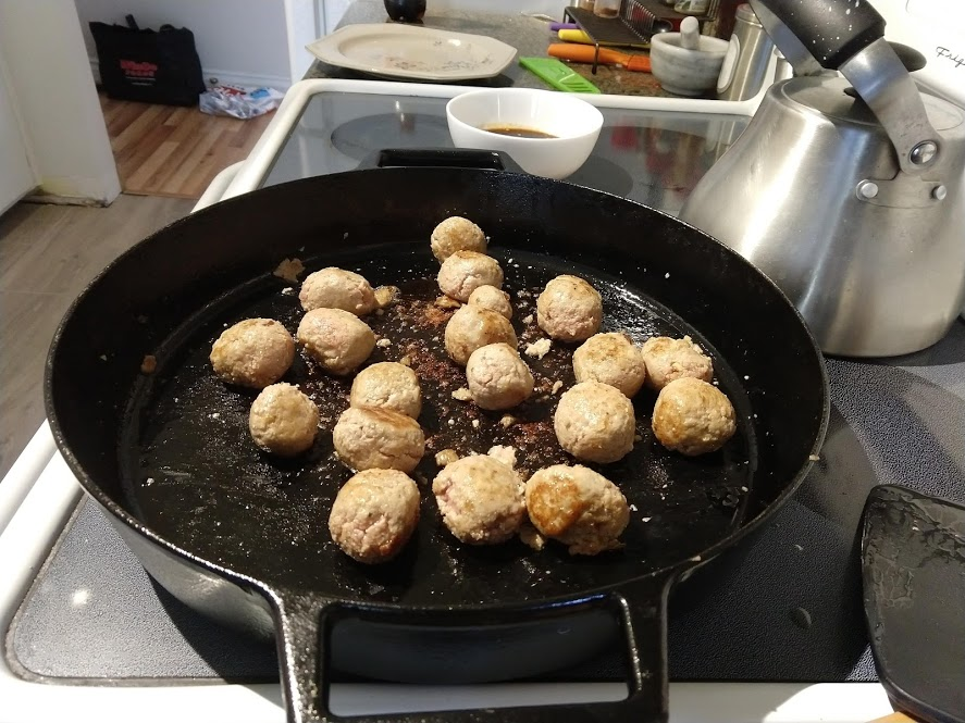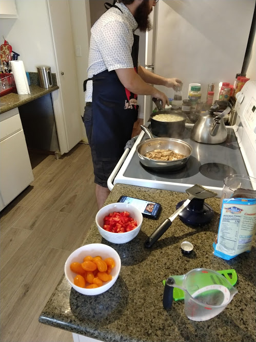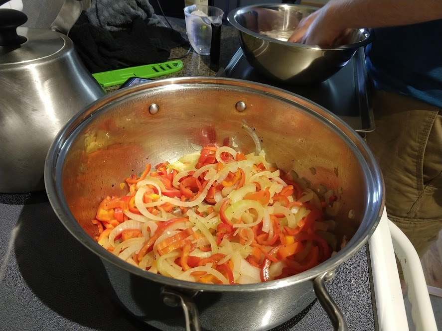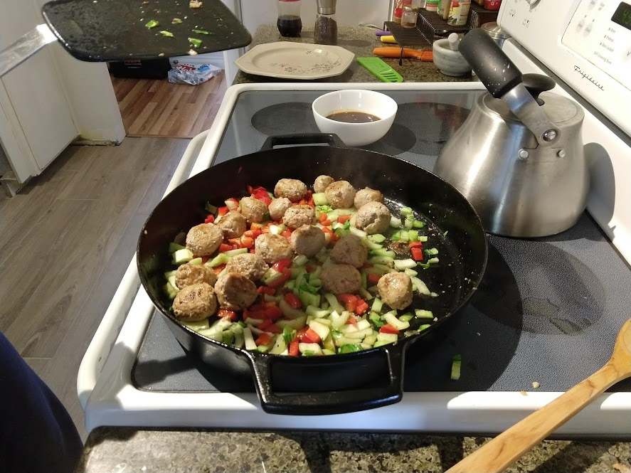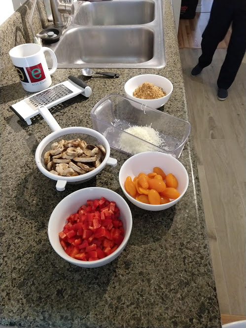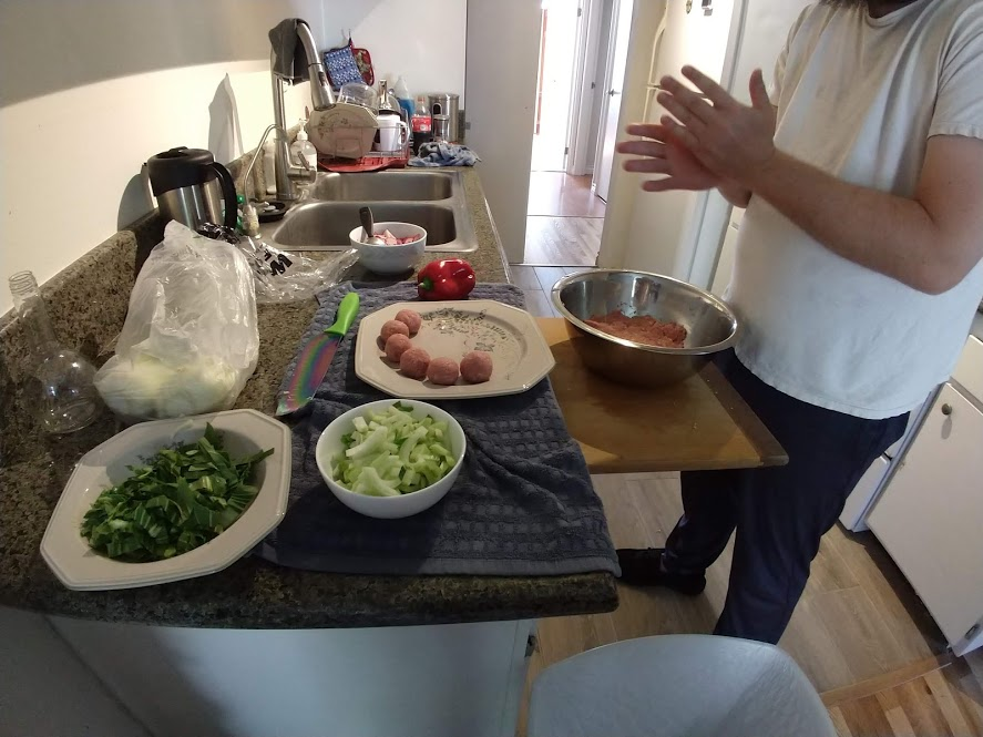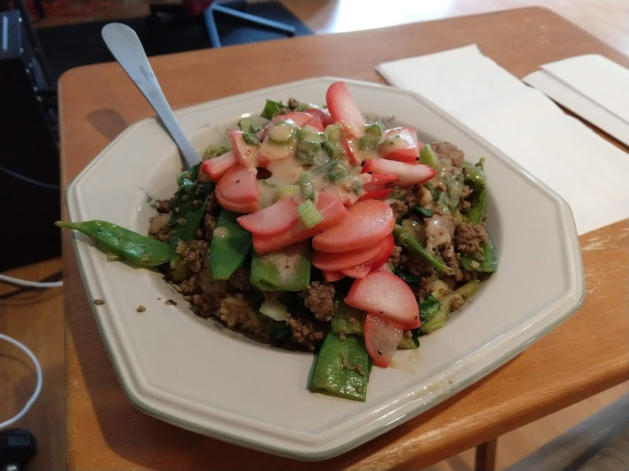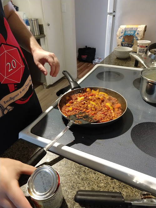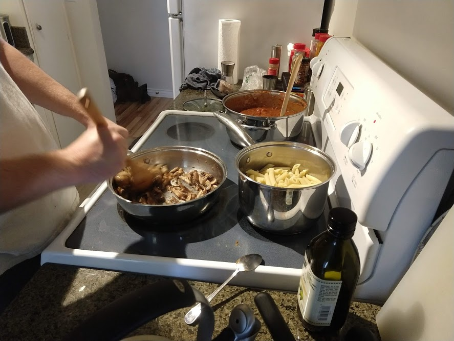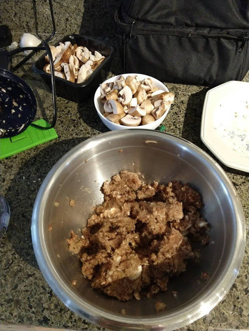 Cooking the enchilada fillingFilling and wrapping up!First one placed!Fresh out of the ovenDelicious enchiladas!Prepping veggiesCooking in progressStir-fry with radishes and peasLeftovers; note how the radishes have their colour spread out when you leave them in vinegarChopping radishesMaking meatballsCooking them in cast-ironBrowned meatballs!With veggies mixed inMeatballs and rice and radishes and veggiesPot stickers and riceSlow-cooker pork and split peas and bok choySplit pea soup!Oven-roasted cauliflowerCauliflower and veggiesPouring a sauce over the cauliflowerAdding radishes. Lots of radishes this month, eh?Garnished with diced almondsSalmon steaks!Potato slicesServed with green beans and red bell peppers, and a radish sauceLeftover cauliflower and rice and green beansGinger slices in a pot of water! What could it be?Whole bunch of spices – it's chai, of course!Add in the black tea leavesWhoops, I let it steep for 20 minutes instead of 5. Milk to the rescue!Shredded zucchiniIngredients for the dish – cheese, green onions, limesMixing the zucchiniIt's quesadillas!Zucchini quesadillas with golden raisins and sour cream sauceJust look at the golden raisins in there!Mushroom and veggiesGnocchi is ready!We had grandma T over for lunch!Cheesy mushroom gnocchi with breadcrumbsTurkey burgersTurkey burgers that are brownedLeftover BBQ marinade as a sauceBuilding the tower of burgerFinished burger!Cheesy potatoesIced smoothies!Lots of mushrooms!Huge pot of veggiesDiced mushroom pastePasta, veggie sauce, and sauted mushroomsAll mixed togetherServed up mushroom raguCrackers and salami and cheeseVeggies preppedNote John working the dough in the backgroundOpen-faced pie! With baby arugula, feta, mushrooms, and onionServed up open faced pie halfSecond helping, with whole grain wheat doughCherry tomatoes and feta and baby arugulaCrackers with the leftover pie makingsMore quesadillasMushroom quesadilla with cheesy veggiesInside of the quesadillaBlack bean soft shell flour tacos with fried zucchini