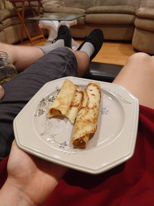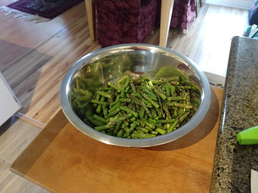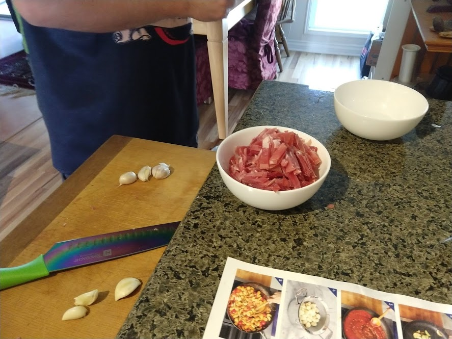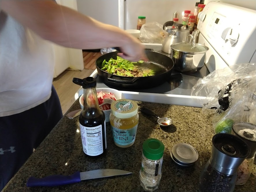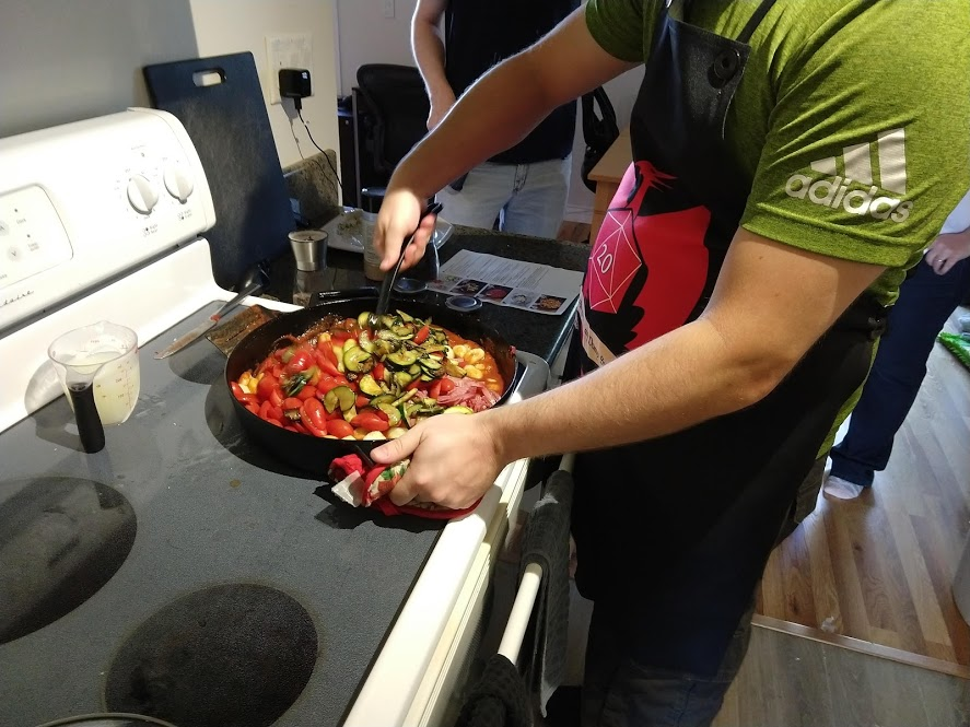 Chopping zucchiniBig ole bowl of prosciuttoPan-searing the zucchiniBig bowl of asparagusMixing all the ingredients togetherProsciutto gnocchi!Our guests brought over these Belgian crepes, which were deliciously sweet for a dessertTurkey burgerLeftover black beans and radishes for the burgers