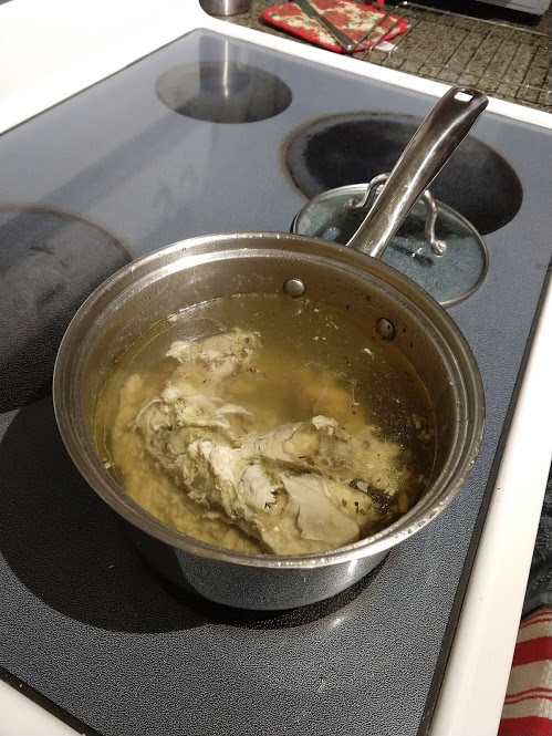 An ideal chicken and dumplings starts with rendering a whole chicken carcass into a broth. That's as simple as pouring a bunch of water (enough to cover the carcass) into a pot, letting it simmer for a few hours, then straining any bones out.