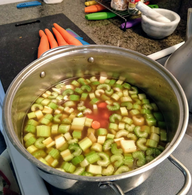 Once you have the broth, then you add your veggies. I'm fond of celery and carrots, but we've also had success with green peas and corn. Onion is also a good choice, as are peppers. We even did it with tiny potatoes once, halved!