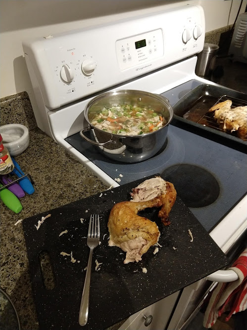 Next comes an optional meat. If you started from a chicken, you probably have shreds of chicken leftover from carving it up. Those can be tossed into the pot as well.