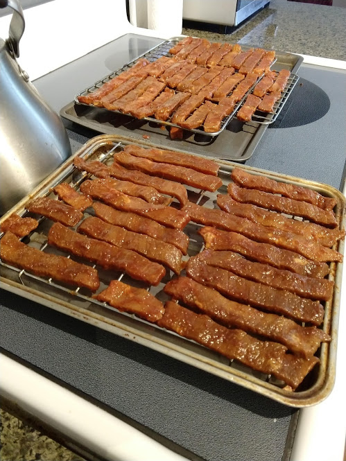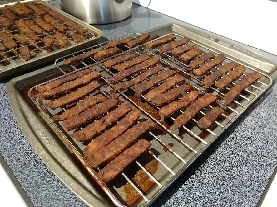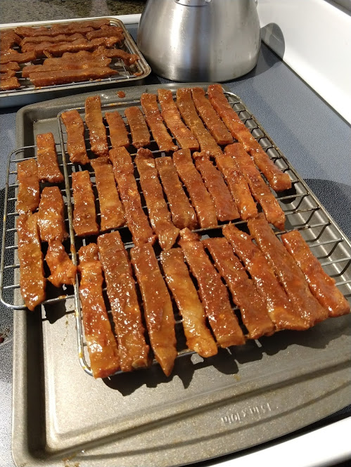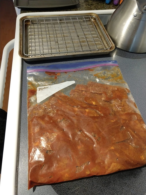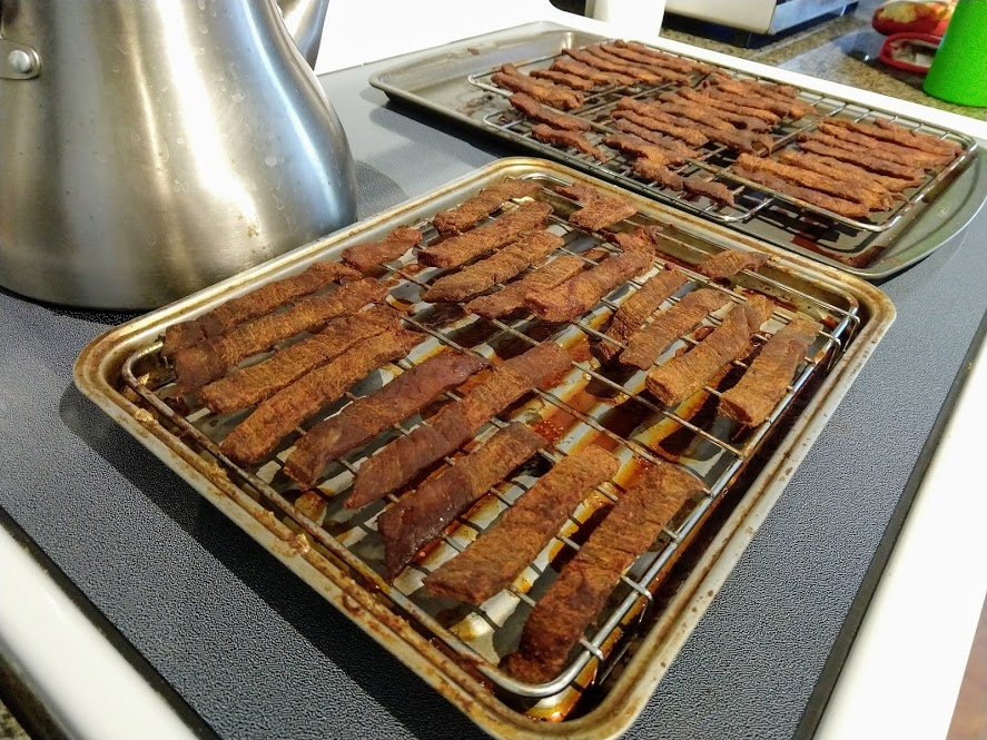 If all went well, you'll have some dehydrated jerky ready to bag up and take on the trail. (Or to eat within a day, I'm not one to judge).