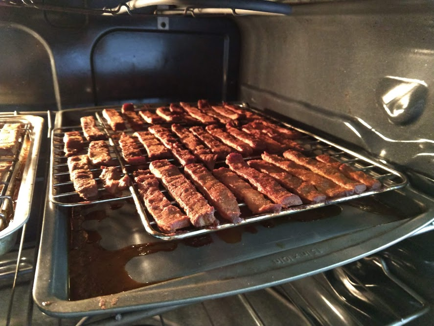 The big picture is that we take small strips of meat and marinade them overnight, then dry them out in the oven with relatively low heat for several hours. Convection ovens work great for that, or if you can blow a fan to circulate air to speed up the drying, but I've done several batches with nothing but the door propped open in an electric oven.