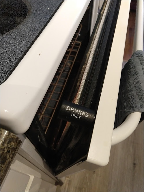 You will also need a way of propping the oven door open to dry out the air. Preferably you use one of those oven drying magnets that keeps the light off, like this: