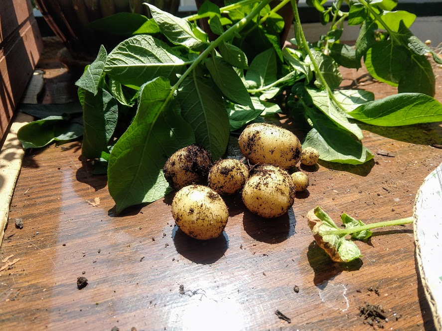 You're supposed to keep burying the stalk of the potato plant as it grows taller, so that over time the soil gets deeper and deeper and there's more space to sprout potatoes. Next time!