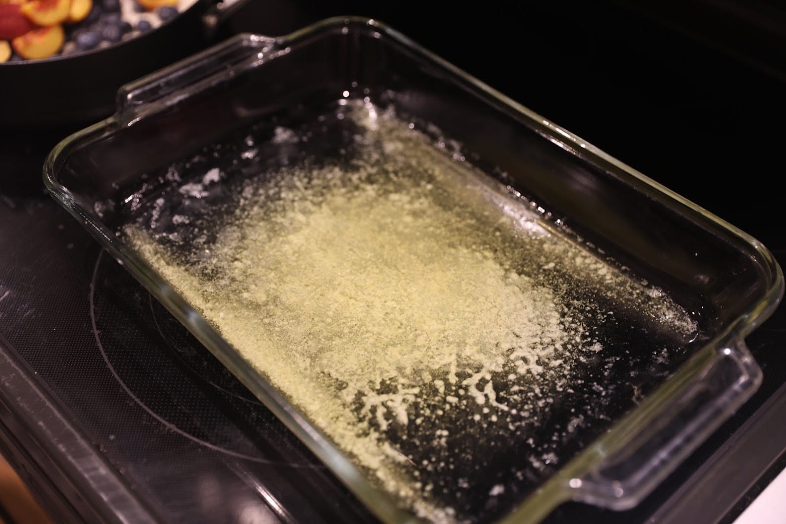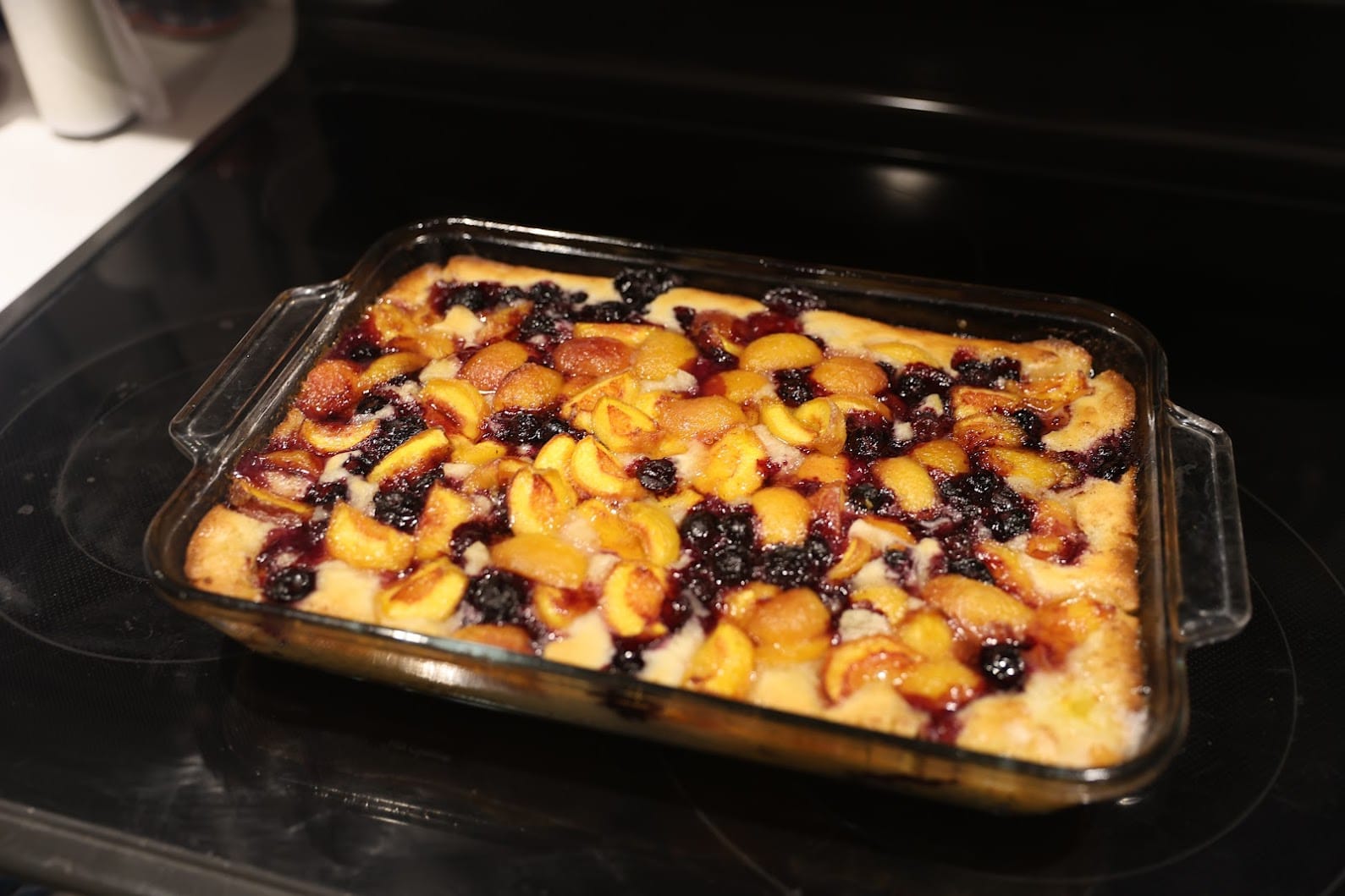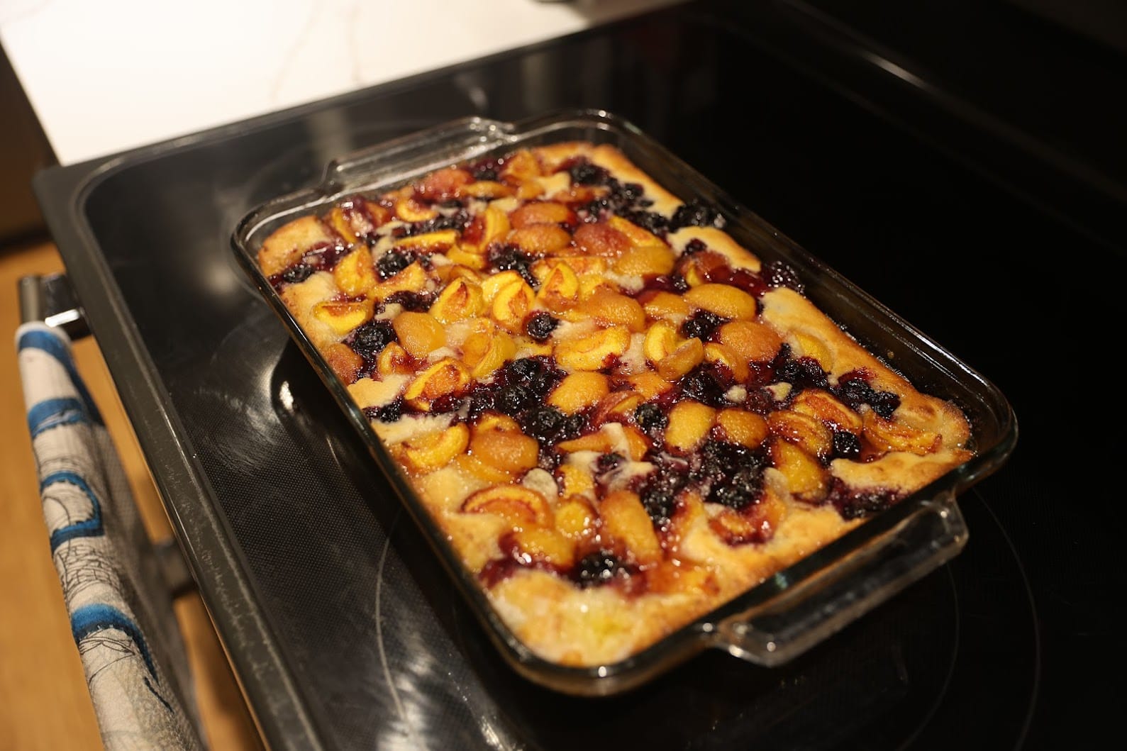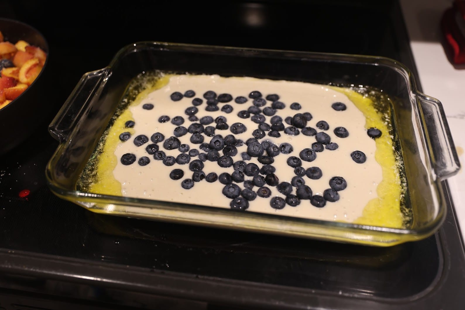 - Pour the batter into the butter in one contiguous blob, then drop the peaches and berries onto the middle and flatten out. Don't mix the batter or the butter!