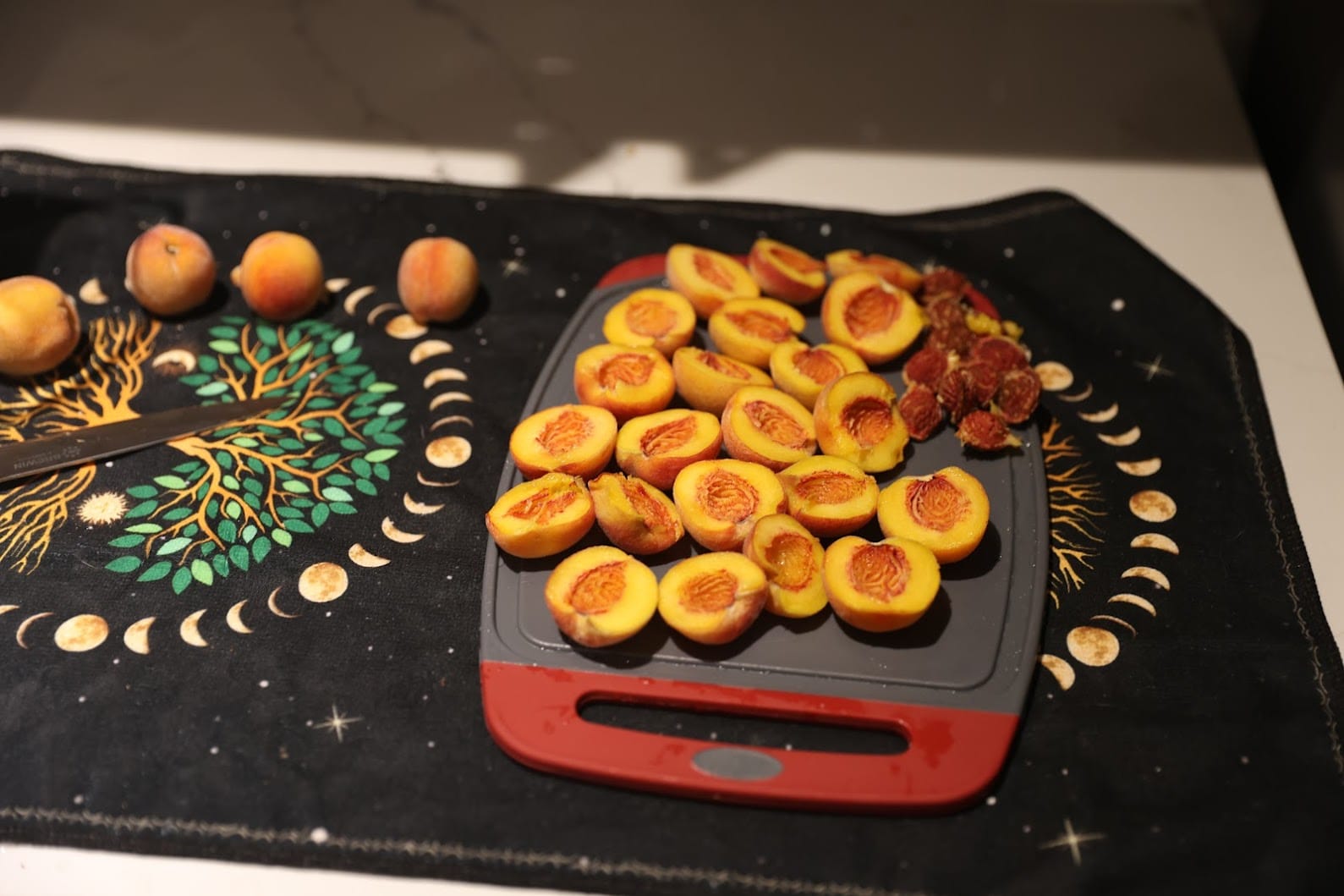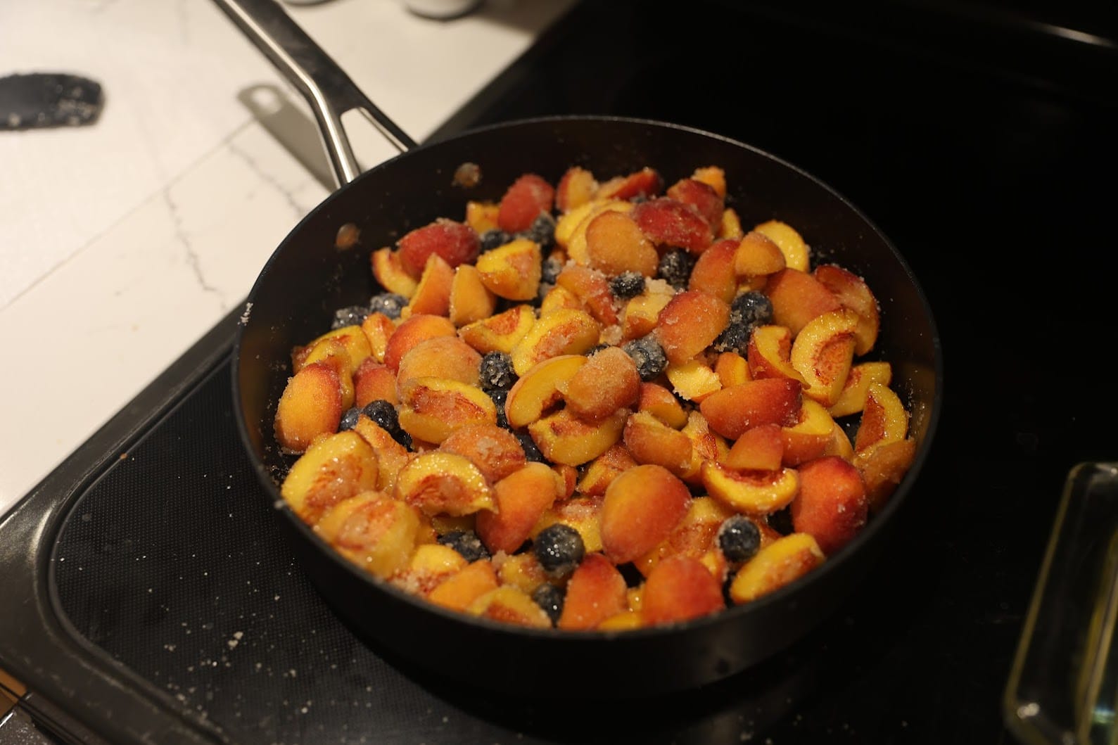 - 3/4 cup granulated sugar mixed into a bunch of small peaches (quartered) and some blueberries (about 1 carton), cooked on the stove to mix juices and sugar into a syrup